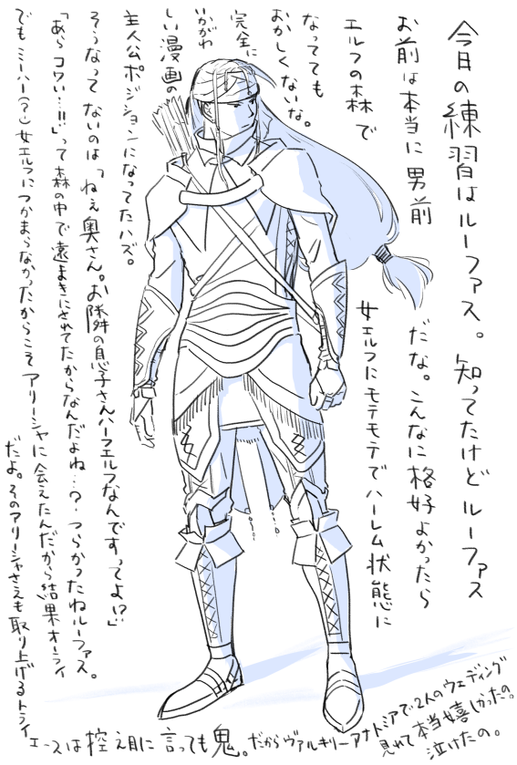 ルーファスの服装練習してたんだけど模様を入れる前に力尽きてしまった。今日はだいたいの構成をつかんだだけで良しとしよう。ルーファス格好いいなぁ。これでcv.中村悠一だもんなぁ。ひねくれハーフエルフがピュワ健気お姫様に出会って段々心を開いていくルーファス視点のアニメ作ってほしい。ゾルデでアリーシャと出会うシーンでもじもじアリーシャの背後にキラキラエフェクトいっぱいかけてほしい。