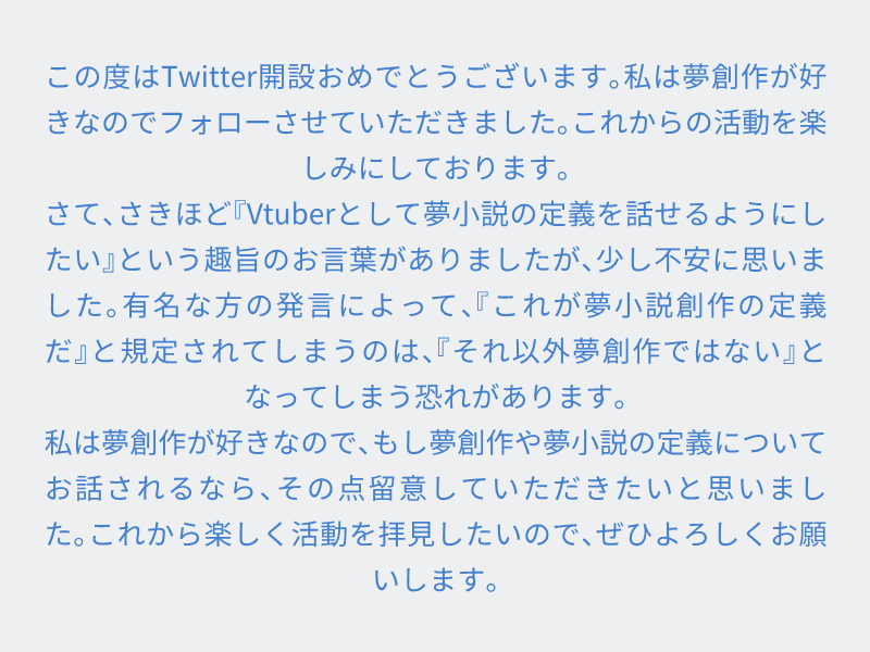 yume_no610☆quiet followINFO拍手コメントの返信になります。(二枚目が返信です) show all(+1 images) Tap to full screen (size:800x600).Repost is prohibited Let's send reactions! freqpopularsnackothersPayment processing Replies from the creator Follow creator you care about!☆quiet follow yume_no610INFO拍手、コメント有難うございます!私でVtuberに興味を持って頂けてすごく嬉しいです!配信の頻度はあまり高くありませんが、よければまた是非見てみてください~!犬のおやつ、ビスケット系はほぼ当たりなんですけどね。先日さつまいもキューブ的なものが美味しそうだったので買ったのですが全然美味しくなくてしょんぼりしました。犬は大喜びでした。今後も色々食べようと思います! yume_no610INFOどちらも同じ方ってわかってるので、お声に関してはこっちで返信しちゃいますね!お声褒められる事なんてない人生だったので嬉しいです~~~~。動画勢の予定なので、NG集これからもどんどん量産されちゃうの為リサイクルもかねてぽいぽい投げると思うので滑舌の悪い女を聞きたくなった時などにご活用ください。本当に有難うございます~~~嬉しい~~~~~~~!!! yume_no610INFO支援有難うございます!初めてのご支援がまさかの1500円とか光栄すぎます…嬉しい…。立ち絵とかに惹かれたフォロワーをふるいにかけないと…っていう使命感でフリートしたんですけどまさかの余計気に入って頂けて嬉しいです。これはずっとついて来てくれる方なのではと思いました。趣味動画の投稿も是非楽しみにしてください! yume_no610INFO私も好きでーす💜(ちょろい) yume_no610INFO私自身、長年夢小説をコソコソと隠れるように執筆を続けていました。ですがVtuberという立場だからこそ出来る事もあると気付き、結果として夢創作が増えるような活動が出来ればと思います。沢山の物語を紡ぎたいと思いますのでよろしくお願いします。活動前からこんなにも応援して頂けて本当に嬉しいです! yume_no610INFOこちらこそ素敵な感想有難うございます!私はこの感想のおかげで幸せな気持ちになれました…。