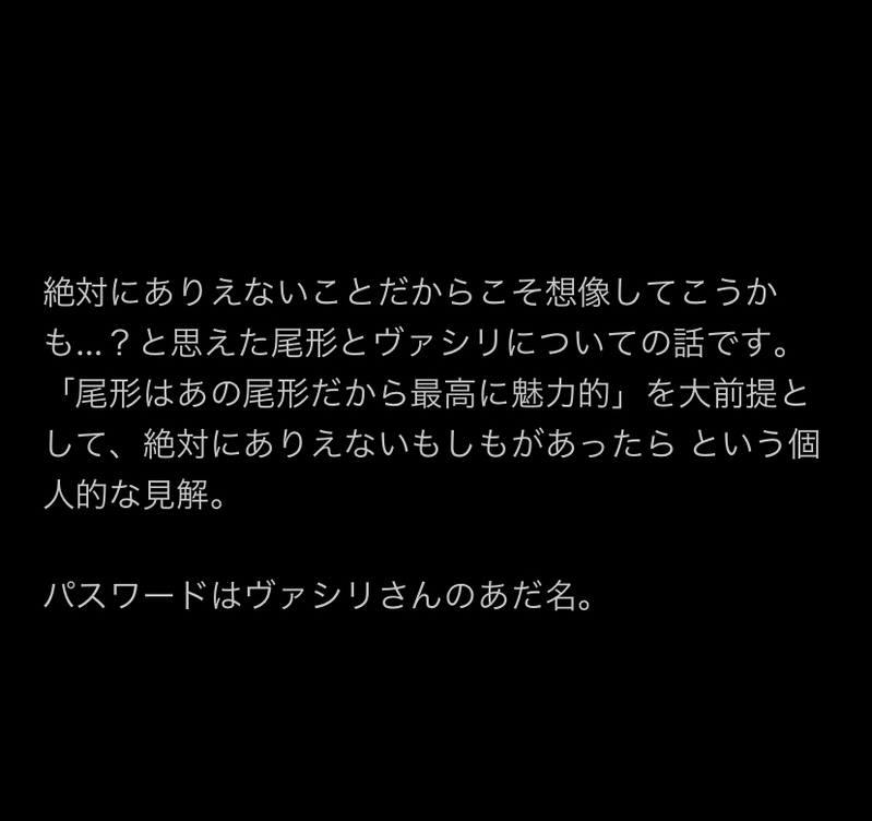 感想置き場☆quiet followMEMO絶対にありえないことだからこそ想像してこうかも…?と思えた尾形とヴァシリについての話です。ネタバレもあり。「尾形はあの尾形だから最高に魅力的」を大前提として、絶対にありえないもしもがあったら という個人的な見解。パスワードはヴァシリさんのあだ名。 show hide show all(+1 images) Tap to full screen (size:828x779).Repost is prohibited Let's send reactions! freqpopularsnackothersPayment processing Replies from the creator Follow creator you care about!☆quiet follow 感想置き場MOURNING🥷🥚が現代でこんな香水つけてたら嬉しいなというオタクの妄想です。必ず冒頭の注意文をお読みください。 6054 感想置き場MEMO北海道旅行最終日の日記です。書式も気にせずメモ書きしたものなので読みにくいかと思いますが、ご容赦を。 11 感想置き場MEMO北海道旅行3日目の日記です。書式も気にせずメモ書きしたものなので読みにくいかと思いますが、ご容赦を。 13 感想置き場MEMO北海道旅行2日目の日記です。書式も気にせずメモ書きしたものなので読みにくいかと思いますが、ご容赦を。 8 感想置き場MEMO北海道旅行1日目の日記です。書式も気にせずメモ書きしたものなので読みにくいかと思いますが、ご容赦を。 11 感想置き場MEMO北海道の博物館に展示されていた臼を見た際に、謎に感慨深くなってホロリときた話です。かなりふわっとしてます。ゴカムのネタバレを含みます。パスワードは鯉登音之進の好きな食べ物。 4 recommended works lucerelleDOODLEHappy Valentine's! claurenfrDONE ケフィアDOODLE #2024ロナドラすレナべ交換会交換用に描きましたが、普通にパス付公開に変更します🤤交換してくださった皆様、ありがとうございました!性癖に突っ走った一枚絵です😓(壁尻&感覚遮断&付き合ってない両片思い)※18才以上のみ閲覧可です🔞(R-18 over??? yes or no) CC的厨房DOODLE 1397 MothDOODLE尝试一些新的画法…… tetoraaoDOODLEしゃけご氏に貰った配信中に描いてくれた機械姦性癖で好きって言ったら描いてくれた流石にワンクッションおいた しおしおDONE2025めりくり🎄 2 DaihukuMiyukiDOODLE「スグリ、下にね、いつもと違う下着、着てきたの……変じゃないかな……?私にはこういうのまだ、早いかな……」 顾黎DelphinusnyaDOODLE去,把他做掉jpg奉孝送的www