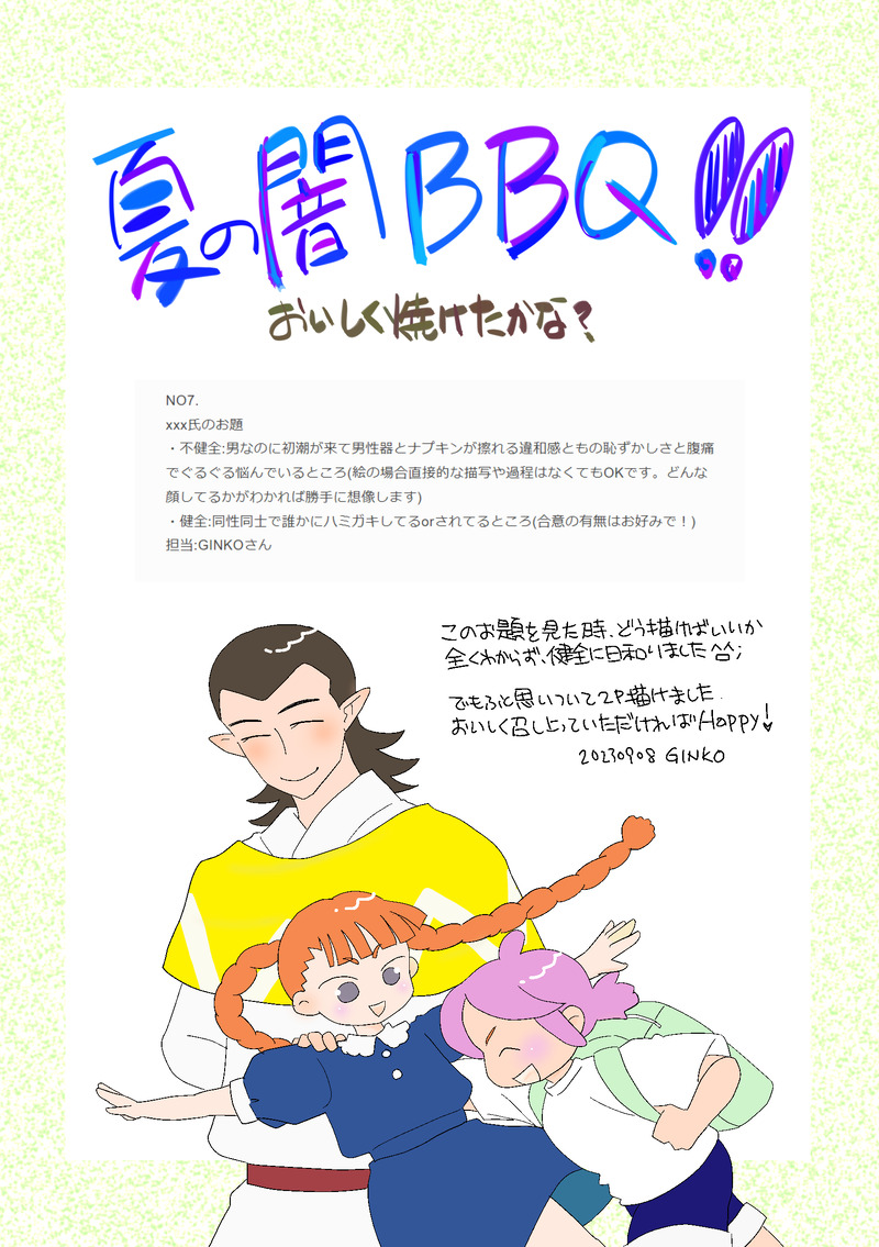 GinkoLxh☆quiet followDONE「夏の闇BBQ」企画作品おのおの性癖を持ち寄り、交換して作品を作る性癖企画の第3弾健全ネタと不健全ネタ2本2023.09.08 show all(+3 images) Tap to full screen (size:1631x2315).Repost is prohibited Let's send reactions! freqpopularsnackothersPayment processing Replies from the creator Follow creator you care about!☆quiet follow GinkoLxhDONEバレンタイン羽夕冠 ほのぼの映画軸でも現代ifでもどっちでも大丈夫 8 GinkoLxhDONE2024/05/15→2024/06/03 Believe「風息樹アンソロ」に寄稿した原稿とは別に、後から描いたもの。少し時間が経ってから、冠萱さんが小黒から事件の聞き取りをしている、というシチュエーション。 5 GinkoLxhDONE #阿赫が風息に遭う話 できた順に、少しづつアップしていく試み10/7 3ページを追加10/8 4ページを追加10/16 5・6ページを追加(1~6 出力し直し)10/21 7ページを追加 7 GinkoLxhDONE「夏の闇BBQ」企画作品おのおの性癖を持ち寄り、交換して作品を作る性癖企画の第3弾健全ネタと不健全ネタ2本2023.09.08 4 GinkoLxhREHABILI◆激活 -activation-◆2023.09.02風息が最初にチカラを使った相手は虚淮だろうと思ったところからできたもの発動、という意味で「activation」を翻訳したリハビリを兼ねて、99%iPadで作画 6 GinkoLxhDONE20230701-2 エワ用 イラスト 弓場&帯島 5枚弓場ちゃん&おびにゃんのイラストを集めました・エイプリルフールネタまんが 1P(再録)・エワ用店舗(床)カット ※描きおろし・初公開・フォロワーさんのバースデーお祝い(再録)※修正あり・水着おびにゃん ※初公開・弓場帯 唯一のCPっぽい絵(再録) 10