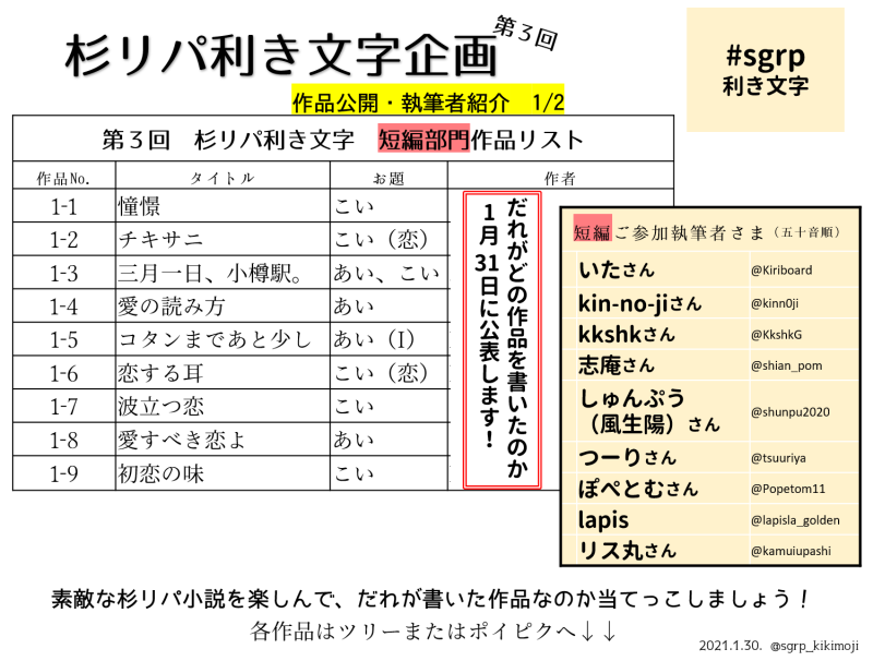 #sgrp利き文字 企画用アカウント/ 金カム二次創作杉リパ小説./ 匿名の杉リパ小説を募集・紹介し、作者を当てっこする遊び. 二次創作にご理解のない方は閲覧しないでください.