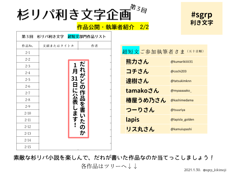 作者予想投票ページ→ https://docs.google.com/forms/d/e/1FAIpQLScLKegp35RrDA1voZEHC2n8_Wwkd234ME86Y9nkXzoo7T7FFA/viewform