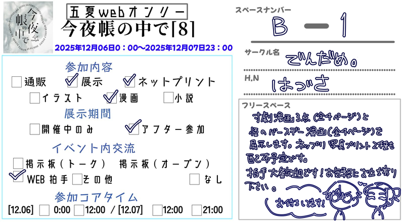 色々と忙しくて、新規絵を描く時間がないので、告知シートで失礼します!!webオンリーの展示ですが、ポイピクで展示を予定していたのですが、最近なんだかポイピクの調子が悪いので、Privatter+の展示に変更しました!こちらにもアフターでwebオンリーの展示漫画はうpする予定なので、よろしくお願いします!!