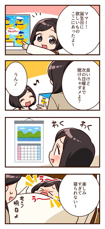 はなまるFX☆quiet followDONE購入はしてありましたが、開封は誕生日までお預け♪毎日楽しみにしている様子はうかがえましたが、前日にとうとう眠れなくなってしまったようです(笑)お風呂で遊ぶ犬のおもちゃに「可愛すぎる~」とのリアクションでした(*ノωノ) #はなまるFX hanamaruFx #4コマ fourPanelComic #4コマ漫画 fourPanelComic #絵日記 diaryWithIllustrations #日常 daily #女の子 girl #子供 child #オリジナル original #誕生日 birthday #プレゼント gift Tap to full screen (size:443x960).Repost is prohibited Let's send reactions! freqpopularsnackothersPayment processing Replies from the creator Follow creator you care about!☆quiet follow はなまるFXDONEあけましておめでとうございます〜( ´∀`) 2021年も何卒よろしくお願い致します〜m(._.)m 年末に大雪が振り年始は朝から雪かき(T-T) 身体中が痛いです〜(*_*) 今日からまたよろしくお願い致します〜(*^^*) はなまるFXDONE本日が2020年最後の投稿となります💁🏻♀️次回は2021年1月4日からを予定してます😊今年も本当にありがとうございました🙇🏻♀️来年もよろしくお願い致します&良いお年を~です🎍 はなまるFXDONEサンタさんを信じている息子。お願いされた物がなくても代替えができないのでギリギリだと探すのが大変(-.-;)我が家には受付の締め切りがあるのですが、毎回なかなか決まらずヒヤヒヤします(^◇^;) はなまるFXDONE先日、息子が参観日のお知らせを学校から持ってきました。小さい反抗期はあるものの来て欲しいと思ってくれるだけで嬉しいです(T_T)きっと高学年になると来なくていいと言われるんだろうな。。。 はなまるFXDONE今日で11月も終わりますね(^_^*)日増しに寒くなり、お鍋や温泉など温かいものが恋しい季節(*´꒳`*)皆さんの冬といえばは何ですか(´∀`)?? はなまるFXDONE運動会の練習で毎回6位の息子。あまりに落ち込んでいたので1位になったら欲しがっていたゲームを買ってあげると言ったところ、、、本番では1位になっていました(-.-;)恐るべしご褒美パワー(o_o) related works はなまるFXDONE冠婚葬祭でおめかししたときの一幕です(*^^*)久々のイヤリングにテンションの上がった娘さんでした(笑)何度も鏡を見に行って微笑ましかったな~ はなまるFXDONEもう帰るわよー! はなまるFXDONEそろそろお盆の帰省から皆さん戻ってこられましたかね(*^^*)?うちの娘さんは毎度、じーじとばーばと別れたくなくてゴネます(笑)でも車に乗った時点でどうしようもないと悟ったのか回復してて・・・この変わり身の早さは逞しいですね(*ノωノ) はなまるFXDONEお遊戯発表会♪ はなまるFXDONE5歳記念で撮影をしに行きました(*´ω`*)去年までは全然だったのに、なぜか今年は恥ずかしがっていて・・・(笑)これも成長のひとつかもしれませんね。4コマ目の後、最終的にはノリノリになってました(^O^) はなまるFXDONEいつもはチラシを折り紙の要領で折って卓上のゴミ箱を置いているのですよね。一気に片付くあの感じが好きで(*´ω`*)ところがサンドイッチ用の容器で全て片付くことに気が付きました(笑)もう必須アイテムですね! はなまるFXDONEアナ雪が大好きな娘さんは、2の曲が流れると一緒に口ずさみます♪ただ少し厳しいなと思うのが、きちんとアナ雪「2」と言わないと指摘されること(笑)1と2をしっかり別物として区別しているのですねぇ('ω') はなまるFXDONE子供の寝相は凄い はなまるFXDONE近所のファミマさんでディズニーくじが半額に(>_<)ちょうど処分のタイミングだったんでしょうね(笑)ここぞとばかりに引いて当たりも出ましたが、なぜかジーニーだけ3つ被りました_(:з」∠)_青色の魔人が自宅を彩っております・・・