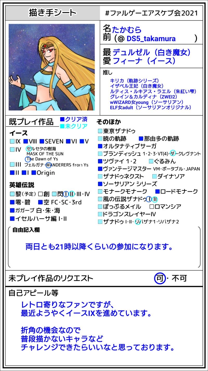 DS5_takamura☆quiet followDONEファルゲーエアスケブ会書き手シート2年分です。 show all(+1 images) Tap to full screen (size:1110x1974).Repost is prohibited Let's send reactions! freqpopularsnackothersPayment processing Replies from the creator Follow creator you care about!☆quiet follow DS5_takamuraDONEソーサリアン生誕祭2023カウントダウン12/1~12/20まで、原作4職業×男女、ソーサリアンオリジナル4職業×男女、G-mode版4職業の20枚描きました!最後のエビルシャーマン様は当日に描きたくなったので描いたものです。手癖全開&顔だけ&5色縛りなら何とかなるかなと思いましたが大変でした!でも楽しかったです! 21 DS5_takamuraDONE暁の軌跡のストーリー読み終えた後にダニーとエルマのスピンオフください!と思いながら描いたもの。モバイルお疲れ様絵と一緒に上げようと思ってたんですがお疲れ様絵が止まっちゃってるので先に上げちゃいます。 DS5_takamuraDONEオクトパストラベラー大陸の覇者3周年芸術の覇者に投稿したもの。全てを極めし者クリア後母と姉の意志を継いで父が血に染めた大陸の光となるアラウネ様をイメージして描いたものの何か目出度くない感じの絵になってしまいました。 DS5_takamuraDONE2023/10/8、ファルゲースケブ会で描いたものたち。ソーサリアンで好きなキャラ(エビルシャーマン)イース3フェルガナの誓い チェスター空の軌跡 オリビエイースX アドルヴァンテージマスター ウィッチ(後夜祭) 5 DS5_takamuraDONEオクトパストラベラー5周年記念の推しセット絵と大陸の覇者のサイドソリスティア&ソローネさん実装記念の顔だけソローネさん。 2 DS5_takamuraDONE仕事帰りにクインシー・ベルでチョコ買ってラシュカル君に渡したら姉ちゃんも一緒に食べようよって言われて一緒に食べてるカイナさんとラシュカル君。バレンタインに合わせたかったやつが6月になってしまったもの。ラシュカル君ホント幸せになってほしい。ホワイトデーにはラシュカル君がカヌレ買ってきてくれて一緒に食べます(幻覚) recommended works みなとねDONE【Roselia (ローゼリア)】ローゼリア:「ニヤッ」って感じで。 y_satoriDONETwitterでのエアスケブ会に参加したもの(後日塗り直し含む)アナログが描ければ良いんだけどね……推しキャラをアピールできて楽しかった 3 simotuki3DONE付き合ってないアロヴァン。シャツの上から乳首立ってたらエロいですよねってのと、ヴァンが無意識におでこをこつんしてるの書きたかっただけw寝起きの頭で即興のアロヴァンなので、誤字脱字あっても許してw付き合ってる場合でも美味しいシチュエーション(*´ω`*) 3 simotuki3DONE付き合っていないアロヴァン。先日、雨に濡れたのがヴァンだったのでアーロンに今度は濡れて貰いましたw先日と同じく、朝の寝ぼけながらの執筆なので、誤字脱字は許して下さいw 4 たぬ(TN)PROGRESSあとはクイナの双眼鏡だけなんだけれどなかなか進まない線画で作業時間半端ない…今回は線を綺麗に!って目標で描いているから最後まで頑張る! joshua_birdyDOODLE oigetsudouDOODLE不埒な❄🔥、敬語言葉責めガチャからセリスさんは後ろからしたいよね! oigetsudouDOODLE不埒な❄🔥、いいように年下男子に仕込まれています(お題ガチャネタ)たぶん🔥さん、自分で触ったことは勿論ですが、イった事もほぼ無いんじゃないかって…メッセルダムでのあれこれを見るに、過去にそういう体験はしたと思いますがギリギリ傷にならない範囲で済んだんじゃないかと思ってます(もし傷になってたら、あの場で❄も黙ってなかったと思うので) ななせDONE初書きヴァンさん。アイビスペイント練習中。