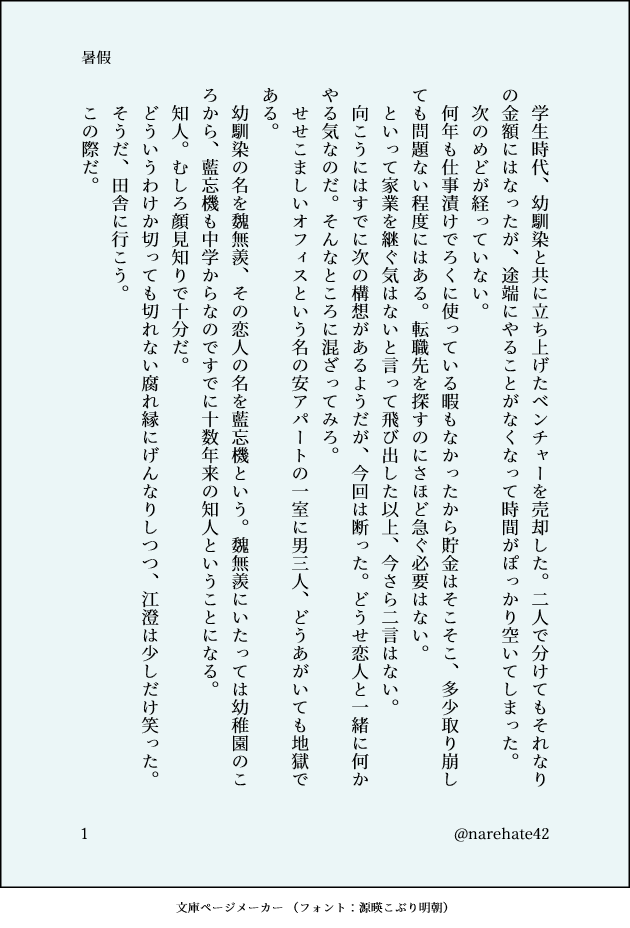 narehate42☆quiet followDONEワンライ/盛夏現代AU虹の麓には宝物が埋まっているんだぜ #曦澄 show all(+6 images) Tap to full screen (size:630x928).Repost is prohibited Let's send reactions! freqpopularsnackothersPayment processing Replies from the creator Follow creator you care about!☆quiet follow narehate42PAST初出:22/05/05モブ澄からの曦澄この話には実際の描写はありませんが鬼畜めのモブレが臭いますのでご注意ください※ちゃんと報復しました血と泥にまみれながらも立ち上がる受けが好きです・異物挿入(張型)・相変わらず受けが攻めに乗っかってる・性描写は薄いです・捏造過多、何でも許せる人向け・過去にモブレ・何人ものモブと関係があった 15001 narehate42DONE現代AU受けが乗っかるほうの睡眠姦だよ悲報:倫理観と♡喘ぎは死にました 2345 narehate42DONE現代AU攻めが襲うほうの睡眠姦だよらめぇ・♡乱舞・申し訳程度の結腸姦お察しの通り「らめぇおしりこわれちゃうぅ」って言わせたかっただけですね悲報:倫理観は死にました 3403 narehate42DONE悲報:触手、あっさりと死す!触手姦、かゆみ責め曦澄のよしよしセクロスを5000字くらい追加しました 8624 narehate42MOURNING遠い昔に書きかけにした新ゲ隼竜 965 narehate42DONEワンライ/嘘 2085 related works yunoDONE江澄を喜ばせよう企画。曦→澄のつもり。閉関した江澄が犬と戯れてます。最初はギャグのつもりだったんですが、着地点を失敗しました。2023/01/28 01:36 up 2880 takami180PROGRESS恋綴3-5(旧続々長編曦澄)月はまだ出ない夜 1437 yaji1_mdDONESM先日ツイートした『Mの自覚がある晩吟君がSMのお店でオーナーの曦臣と出会う話』です。短く区切っていくつか続けるつもりの話です。*SMの話なのでR-18 成人済みの方のみご覧ください*若干のモブ(女)要素があります*現代*SMの話です 2565 tia_10l0DONE「春の気まぐれ」フォロワーさんの誕生日に捧げた曦澄SSです。 6 yaji1_mdDONESMhttps://poipiku.com/5280290/7208921.htmlの続き*SMの話*R-18 成人済みの方のみどうぞ*若干のモブ(女)要素あり*現代1プレイ目(ソフト) 5653 takami180PROGRESS長編曦澄17兄上、頑丈(いったん終わり) 1337 yaji1_mdDONESMhttps://poipiku.com/5280290/7208921.htmlの続き*SMの話*R-18 成人済みの方のみどうぞ*若干のモブ(女)要素あり*現代 1848 yaji1_mdDONESMhttps://poipiku.com/5280290/7208921.htmlの続き*SMのはなし*R-18 成人済みの方のみどうぞ*若干のモブ(女)要素あり*現代 2571 takami180PROGRESS恋綴3-2(旧続々長編曦澄)転んでもただでは起きない兄上 3050 recommended works プミチスキーINFOhttps://fuyaho.booth.pm/items/1582899全年齢CG集販売開始しました。(この絵は先ほど描いた絵です)FANZA→https://www.dmm.co.jp/dc/doujin/-/list/=/article=maker/id=78262/DLsite→https://www.dlsite.com/maniax/circle/profile/=/mak IkaikaikakaPAST◆ティート/ジャンティージャンLOG◆・パロとか女装とかにょたとかごちゃまぜ注意・たまに派生とかいかがわしいのも混じる・気分で消したり増やしたりします・よそさまの探索者をお借りしておりますティート…なるこ宅探索者マフィアジャンパオロ…ちろすけさん宅探索者神父 44 takami180PROGRESS続長編曦澄7なにもない日々 1867 takami180PROGRESS続長編曦澄11これからの恋はあなたと二人で 1617 amaneazumaaDOODLE暴れ江澄。アクション楽しいのみで書いていたんで藍曦臣は登場で時間切れ。私以外に抱きしめられておこな曦澄のネタもちょっと思いついたのでワンドロトは別で追々書いていきたい。 7 tarutotatan082DONE明朗と命を絶とうとする江澄と?な曦臣の監禁曦澄になるはずのもの 7443 ゆづるPROGRESSその2パスワードは曦澄二人の誕生日続けて8桁(MMDDMMDD) 6861 narehate42DONEワンライ/変装ガンジス河の砂の数と同じ数のガンジス河があったとして、そのすべてのガンジス河の砂の数……の中からあなたを見つけるという話 8 A_YING__MAIKING中途半端なところで終わってます。。。ただ江澄から藍曦臣に「俺を抱け」って言ってほしくて書いただけのものです。媚薬でも術でもなく素面で抱いてくれって言ってほしかったの。でもそこまでたどり着いてないよorzなのでまだR18ではありません。藍曦臣大怪我します。怪物の頭が爆発してます。苦手な方は逃げてください! 20
