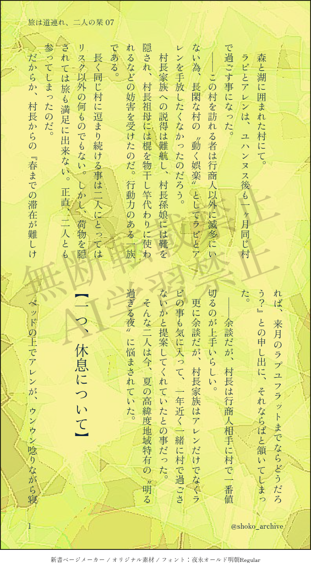 shoko_archive☆quiet followMOURNING守り手ラビとイノセンスを持っていないアレンの旅の話その7。先代ラビアレみはあるのに二人とも正気じゃないから駄目。睡眠大事。 show all(+11 images) Tap to full screen (size:618x1132).Repost is prohibited Let's send reactions! freqpopularsnackothersPayment processing Replies from the creator Follow creator you care about!☆quiet follow shoko_archiveMOURNING守り手ラビとイノセンスを持たないアレンの旅の話その12。アレンの前髪があるので注意(?)なのと、先代ラビはアレンのおでこが好きって話。先代ラビアレの道程がまた遠のいている。 11 shoko_archiveMOURNING支部にあげた先代ラビアレシリーズその3の表紙絵。人形作家との舌戦にて勝利を掴んだ先代ラビが「もっと丸く!」と何度もデザインを変えさせた鳩の、梟が如き丸さよ……。 2 shoko_archiveMOURNING守り手ラビとイノセンスを持っていないアレンの旅の話その11の舞台裏。悩める青少年とそんな頃はとうに過ぎ去った大人の対比って面白いねって話。先代ラビアレに自覚あるんだか無いんだか…。 10 shoko_archiveMOURNING守り手ラビとイノセンスを持たないアレンの旅の話その11。今回はアレン視点。オリキャラにお悩み相談する回。先代ラビアレからまた遠のいている。…どうでもいいけど、マリオネットって“聖人ノ詩篇”に似ている。 14 shoko_archiveMOURNING守り手ラビとイノセンスを持っていないアレンの旅の話その10。先代ラビアレ度は低め。19世紀の中欧は帝国主義と民族主義がせめぎ合っていただろうから、Jr時代の先代ラビは大分色んなものを飲み込んできたのだろうな…。 11 shoko_archiveMOURNING支部に載せた先代ラビアレシリーズまとめその2の表紙絵供養。〜先代ラビにモブお姫様を寄せて〜 recommended works ポイピクミッシェルさんDONE月イチ企画の第七弾です。サイチくんが一人で🚬吸ってるだけのお話です🤭 2986 いかそうめんDONEスケブリクエストありがとうございました✨初めての男女エチエチとってもたのしかったです(*'ω'*) 3 eeyan_m_DONEpass 18↑? y/nBBB水某敬ランド インパしてみた✨…結局いつもの感じになったけど楽しかったです❤︎企画のおかげで某ランドの概念を知れてよかったね👍 4 咲(さく)DONEkiis オメガバースパロきすこれ展示用の漫画です! 13 miantesoroDONEクリスマス当日☆ファミリークリスマス🎄 CatheTRPGDOODLECoC「海も枯れるまで」一応現行・未通過閲覧NG。探索者お借りしました!冬至ネタ🛁🐤合言葉→y べーこんDOODLEJOKER≒JOKER現行未通過❌ま〜〜〜〜〜じでしょうもない自探索者♢の落描きうちの♢大体こうです raixxx_3amDONEブックサンタ企画で書いたお話、恋愛未満。日和くんにとっての愛情や好意は相手に「都合のいい役割」をこなすことで得られる成果報酬のようなものとして捉えていたからこそ、貴澄くんが「当たり前のもの」として差し出してくれる好意に戸惑いながらも少しずつ心を開いていけるようになったんじゃないかと思っています。(2024.12.22) 4803 sy_chuUDONE【comic market 105 DAY1】➡️東4ヤ53a 🍚おこめフェス📗新刊サンプル「迷土のススメ」吉田夢漫画 A5/12P 全年齢頒布価格100円学パロでメイド喫茶する吉田の話※夢主顔あり#gntm夢 #c105 6