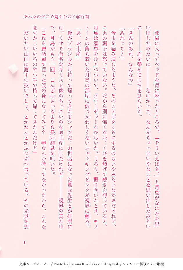 gyoukan_9109☆quiet followDONEフォロイ―さんの書いてらした月日が可愛くて可愛かったのでずっとあたまにあった妄想を文字にしてみました。月日って言ったらはいきゅです。が、なにごともないので日月でも月日でもどちらでも~😊 ##月日 show all(+3 images) Tap to full screen (size:630x928).Repost is prohibited Let's send reactions! freqpopularsnackothersPayment processing Replies from the creator Follow creator you care about!☆quiet follow gyoukan_9109DOODLE昨日書いてた相合傘なみむおちのちゃんと相合傘してるほう。やまなしおちなしいみなしは仕様です… 4 gyoukan_9109DONEみむらくんとおちくんの相合傘妄想。 gyoukan_9109DONEひなたくん右オンリー開催おめでとうございます!今回の新刊に入っているおはなしの後日談、みたいなものを書きました。本編読めないのに後日談とは…?!という感じですが、なんかこういうおはなしがあるんだなーとふわっと読んでいただければ…w 4 gyoukan_9109DONE『ゆびさきにともれ』月日の日に夏井さん(@nti721)と一緒にネップリに登録した月日②です。高一の冬のひとこま、月島くん視点。 4 gyoukan_9109DONE『ゆびさきにともる』月日の日に夏井さん(@nti721)と一緒にネップリに登録した月日①です。高一の冬のひとこま。 8 gyoukan_9109DONEやまなしおちなしいみなしのバレンタインゆたせい風味。大遅刻ですが書きあがったので。