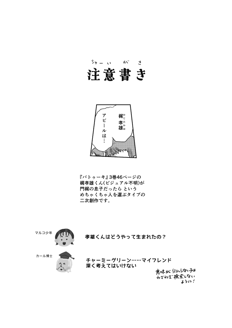 zha2inu3☆quiet followDONE笑う門には梶が来る 参!開催おめでとうございます。バの梶孝雄くんが門梶の息子だったら……という人を選ぶタイプの二次創作です。カップリング要素少なめ。門梶……好きだ…… show all(+3 images) Tap to full screen (size:4961x7016).Repost is prohibited Let's send reactions! freqpopularsnackothersPayment processing Replies from the creator Follow creator you care about!☆quiet follow zha2inu3DONE笑う門には梶が来るin東京にて頒布した無料配布です。出られない部屋に閉じ込められた門梶。いったいどうなる!?というお話です。 4 zha2inu3DONE笑う門には梶が来る 参!開催おめでとうございます。バの梶孝雄くんが門梶の息子だったら……という人を選ぶタイプの二次創作です。カップリング要素少なめ。門梶……好きだ…… 4 zha2inu3DONE笑う門には梶が来る 弐!展示作品のまちがいさがしの答え合わせです。2枚目に問題、3枚目に答え合わせです。まちがい7個見つけられたかな? 3 zha2inu3DONE笑う門には梶が来る 弐!開催おめでとうございます。門梶赤ずきんパロです。色んな人が女装してたりします。表紙の答え合わせは2月26日16時頃ポイピクにて公開予定です。 5 zha2inu3SPOILER映画のネタバレです。観終わった後衝撃でいちばん最初に話したとこ。 recommended works mnm_373DONE炭善ちゃんとねずこちゃんと獪がくくん 2.3DOODLE凯伽 2.7 wacochidayoDONE⚠️現パロ食満留三郎 koma2minetiDOODLE酔い陸 当たり前に同棲してます(やったね!) 2 ちや!DOODLE 森野クマ3PROGRESS今日の進歩5144コマ目終わり 駄犬🦴DOODLE幼🤕 7 @maaDONE13ページ+13.5ページ目:「一度くらいなら教わってあげてもいいですけど」の続き シュナルル会話シーン1ページ追加しました 2 aiyadayo_DOODLEまじ何回も喧しくてごめんなんだけど🐣🌾よい~!!! 3