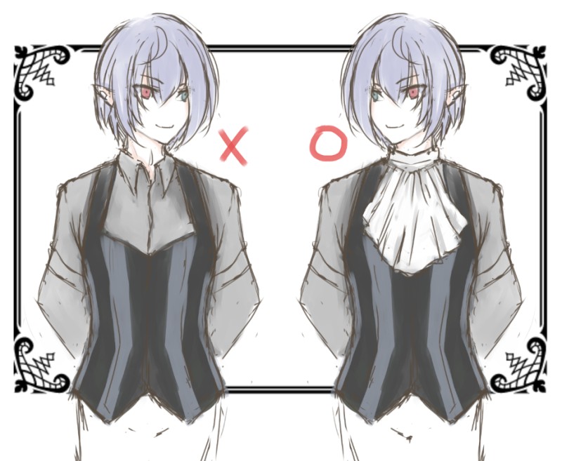 あまりの衝撃に描き殴ったのでド汚いのは申し訳ないんだけど、ハロウィングリームニル君の服の形、ずっと左だと思っていた…コルセットベストとかえっちだなってずっと、ずっと思っ……あの胸元の白は、ジャボだったのね!?!?!?!?そうだよね!?吸血鬼だもんね!?