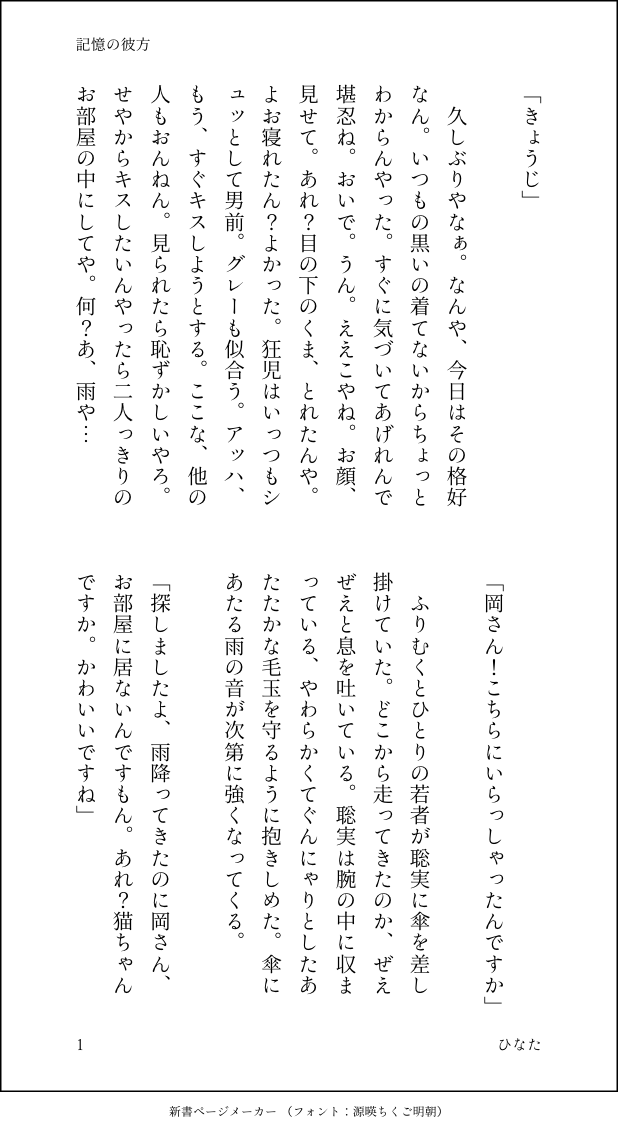 ひなた☆quiet followDOODLE==記憶の彼方==8月11日に寄せて。どちらの曲を歌うのかはわからないけれど。年が過ぎて全ての記憶が曖昧になったとしても、聡実くんは心の底にずっとあの夏を抱えているのだと思います。こちらの絵を見ながら書きました。https://twitter.com/gregcatarino1/status/1427721335434846215?s=21 #狂聡 madGenius show all(+2 images) Tap to full screen (size:618x1132).Repost is prohibited Let's send reactions! freqpopularsnackothersPayment processing Replies from the creator Follow creator you care about!☆quiet follow ひなたMENU7月28日新刊「天国への階段」R18Gサンプル⑤R-18『弁護士 岡聡実の策略』より抜粋ラブホ延長🏩X(Twitter)にお取り置きのアンケートがあります。狂児が銃弾に倒れるシーンとか、聡実くんが銃を構えるシーンとか、パチンコ館内放送とか、ふわふわ紐パンとか初夜とか見せっこもございまして、てんこ盛りの新刊楽しんでほしい…(R18G)成人でいらっしゃいますか?(y/n) 8 ひなたDONE2020.12.12新婚1年目の成田狂児が、風邪をひく話。 4 ひなたDONE2021.01.01 Twitter掲載== 一年目 ==結婚一年目のお正月を過ごす、二人のお話。 5 ひなたDONE2021.01.01 Privatter掲載コカイン星人がお薬を始めたお話し。暴力表現があるため、R-18です。*ご注意*・星人の名前を「湊」にしています。・組長、小林、成田がいます。・作中の薬品は過去実際に存在したものですが、現在は製造販売を中止しています。PW 成人でいらっしゃいますか? 5357 ひなたDONE2021.02.23 Privatter掲載好きしか言えない一語症(いちごしょう)になってしまった聡実のお話。4520、聡実大学3年生。PW 成人でいらっしゃいますか? 11918 ひなたDONE2021.02.15 Twitter掲載== Missing ==4217空港再会直前と4318再会後のバレンタインデー。どうにかして気持ちを伝え続けたかった聡実とそれに気づく狂児のお話。 4 related works HAYASEDOODLE🔞えっちしてる(だけの)狂聡 挿入あり 独占欲強め成田 ↑18?yes/no 10 ふちさきDONE⚠️ 3914 狂聡♀「誘拐契約」https://x.com/huchi_k2/status/1799911114815463480?s=46 4 モズさんのポイポイDONE狂聡ねこ₍˄·͈༝·͈˄₎◞ ̑̑₍˄·͈༝·͈˄₎◞ ̑̑ カフェラテDONE狂聡 おいしいよ! 2 LFjIort6SiZnaMmMOURNINGこういうスタンスの狂聡ももえる 6 ちょきDONE狂聡 mitaka_05050401DONE20220401🎂岡聡実生誕祭💖聡実くんお誕生日おめでとうございます!文字なしと加工なしver.もアップします 4 unXXXhmMOURNING行為中に狂児の顔よく見えないなって思って、狂児と会う時だけコンタクトに切り替える聡実くん※狂児の刺青どうなってるか分からないので適当です 5 あらうみDOODLEファ。15話の感想をだらだらと書いてみました。考察じゃなくてあくまで感想。本誌ネタバレ防止ワンクッションです。 4396 recommended works しんやTRAINING自給自足の練習ポーズ集がありましてね、そっから後ろからだっこのポーズ模写。力尽きましたが isona07_2DOODLEタイトル【大人げない大人】 8858 モズさんのポイポイDONEお互いの色に染まったハイヒール👠 2 ねむねむTRAINING狂児に寝る時に手繋いでって言ってほしいなって思ったので4520くらい……東京に狂児のアパートがある設定 4 すあま🦥TRAINING中太のセッ……こういうのどうやってお勉強すべきなの…(困惑) budou_to_ameDeep Desireきょう児のtntn踏むさと実くんってかわいいな〜という妄想です😇 womiz_u032DOODLE⚠️にょた百合想雨生理が重たい☔️さんとよしよしする🐧ちゃん budori_karaokeDONE成田さんが聡実くんの部屋でお留守番をする話です。お付き合いして半年ぐらい?とっても仲良しです。よろしければ…🙏※直接的な描写はほぼありませんが、会話中にちょろっと単語レベルで出てくるので一応Rを付けております。 13 unXXXhmMOURNING行為中に狂児の顔よく見えないなって思って、狂児と会う時だけコンタクトに切り替える聡実くん※狂児の刺青どうなってるか分からないので適当です 5