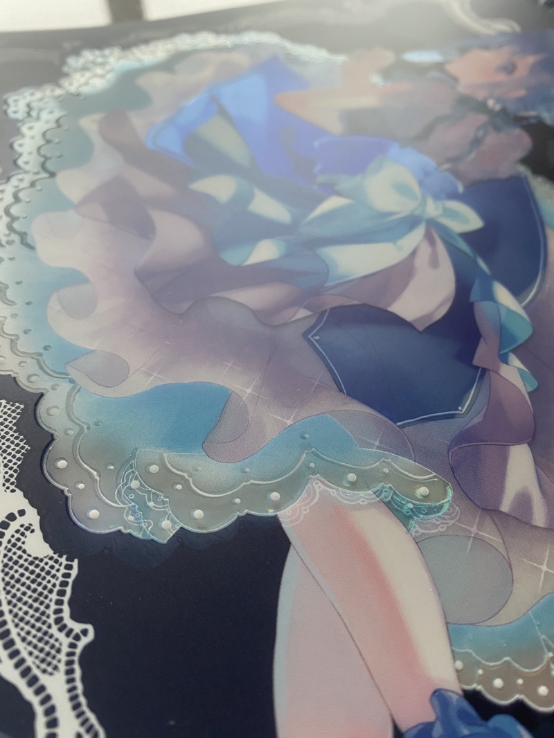 レインボーペーパーにマットPPで抑えた後ニスで虹光沢が復活するのですがクリアフィルム越しでも再現できないかなとしてみた次第です。加工は奥付にあるけど後で普通にツイートすると思う。