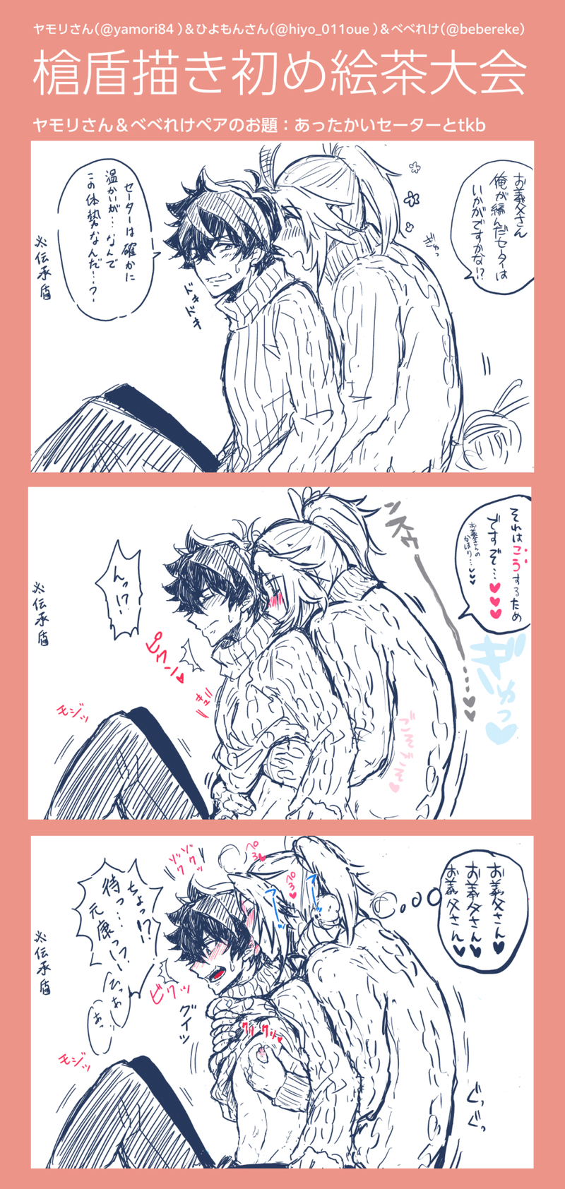 bebereke☆quiet followDONEヤモリさん(@yamori84)とひよもんさん(@hiyo_011oue)と新年槍盾描き初め大会したログの一部をまとめました。ヤモリさんとペアで担当したセーター槍盾です。tkbあり・じんわりえちちちです。めちゃくちゃ楽しかったです。ありがとうございました〜!!画像は全3枚です #槍盾 gunShield show all(+2 images) Tap to full screen (size:1000x2106).Repost is prohibited Let's send reactions! freqpopularsnackothersPayment processing Replies from the creator Follow creator you care about!☆quiet follow beberekeDOODLE衝動的に描いたモブ💧らくがき縛られて怪しい薬を見せつけられている💧さん事には及んでいません いつものお味です 2 beberekeDOODLE🔞🐺🛒らくがき。致す直前です 3 beberekeDOODLEtnsk 🛒受🔞らくがきリク頂いたモブムコとか壁尻とか練習に描いたやつとか 怖がるムコさんかわいいね… 6 beberekeMOURNINGいぬかいさんらくがき ちょっといかがわしい 2 beberekeDOODLEひよもん(@hiyo_011oue )さんからいただいたリクエストで描いたES旬のスケベです。楽しかった…リクありがとうございました! 2 beberekeDONEヤモリさん(@yamori84)とネーム交換させていただきました!お題:ワンニャン槍盾セッセネーム1ページめ&盾作画:べべれけネーム2ページめ&槍作画:ヤモリさん注目ポイントはヤモリさんによる雄全開の犬槍と雄尻です!!最高にエッッッチ…めちゃんこ楽しかったです…‼︎ありがとうございました〜〜〜‼︎ 3 related works yamori84DONE槍盾再録その2!時系列は成り上がり本編後半くらい。 36 ヤナヘエDONE(槍単体絵だけど、槍盾的な偏見が入ってるから一応槍盾タグつけた) ヤナヘエDONE[槍盾] 本編盾とシルト盾とヤベェ空気を全然読まない愛の狩人*槍盾三角関係 2 ヤナヘエDONE|a|ma|za|ra|shi| の |さ|よ|な|ら|ご|っ|こ| に 槍←シルト盾 的なエモみを感じてしまい…… ヤナヘエDONE槍盾的な偏見に満ちた人物紹介です。 3 ヤナヘエDONE[槍盾] 仲良くできない本編盾とシルト盾*槍盾三角関係・続き 2 nori_ponmaruREHABILI伝承槍盾とラフ 3 beberekeDONEヤモリさん(@yamori84)とひよもんさん(@hiyo_011oue)と新年槍盾描き初め大会したログの一部をまとめました。ヤモリさんとペアで担当したセーター槍盾です。tkbあり・じんわりえちちちです。めちゃくちゃ楽しかったです。ありがとうございました〜!!画像は全3枚です 3 yamori84DONEハロウィンの時描きたかった槍盾~。ちょっとアレンジ加えている。うちのまおふみくんは村人文服で狼男は狩人ベースかな村人服は防御が低くていいよね…色んな意味で…^^やはり角は性感帯/// recommended works ᙏ̤̫PAST盾勇 LOG1 腐向け(槍盾)あります 22 ヤナヘエDONE[槍盾] 仲良くできない本編盾とシルト盾*槍盾三角関係・続き 2 ヤナヘエDONE(槍単体絵だけど、槍盾的な偏見が入ってるから一応槍盾タグつけた) ヤナヘエDONE|a|ma|za|ra|shi| の |さ|よ|な|ら|ご|っ|こ| に 槍←シルト盾 的なエモみを感じてしまい…… nori_ponmaruREHABILI伝承槍盾とラフ 3 Na_na__ma_ruCAN’T MAKEトーマスのつもりなやつこんなアングルでしかかけねえよ… yamori84DONE槍盾再録その2!時系列は成り上がり本編後半くらい。 36 yamori84DONE支部ログまとめ槍盾中心①大体まとめ①~③ログから槍盾関連の漫画やネタ系を抜粋してまとめました。 44 FluioDONE盾成备份part1 枪盾枪无差 24