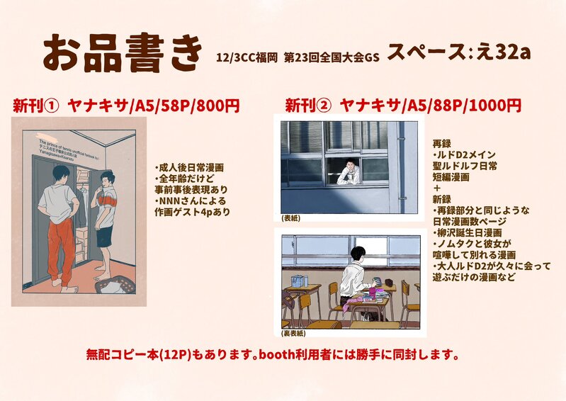i28425☆quiet followMENUhttps://onakasuita7.booth.pm/ Tap to full screen (size:2048x1450).Repost is prohibited i28425DONE新刊と一緒に頒布していたコピー本です。あとがきとページ調整で入れた過去絵のページは載せていません。紙が好きな方は是非boothご利用ください。https://onakasuita7.booth.pm/ 13 i28425INFO新刊と一緒に頒布したコピー本です。新刊を買っていただいたのにお渡しできなかった方向けです。パスワードは新刊のタイトル13文字を入力してください。 17 i28425INFO春コミ内開催全国大会GSで頒布する新刊のサンプルです。booth(https://onakasuita7.booth.pm/items/6675097)navio(https://share.clip-studio.com/ja-jp/contents/view?code=63642566-e038-4bf8-9773-8a0e59c3fe4c&at=1741505218) 30 i28425DONEiPadのおかげで背景の本も塗ることができた。春コミ新刊表紙です。 i28425PROGRESS春コミ締切間に合いますように 祈願投稿 4 i28425DONEまとめiPhone版クリスタのメモリが足りなくて背景の本の色塗れませんでした 23 recommended works i28425DONE木更津兄弟と告白① 15 i28425DONE木更津兄弟と告白② 4 i28425DONE木更津ハーフアップ 2 i28425DONE木更津兄弟 i28425DONE双子は離れていても同じタイミングで同じような怪我をするみたいなことがあるらしいので、淳が髪を切られた日は亮の髪は少し櫛の通りが悪かったかもしれない(些細) 2 i28425DONEチェストバンプ i28425DONE本②https://onakasuita7.booth.pm/items/4471018 44 たくたくDOODLE節分 i28425DONE読唇術 4