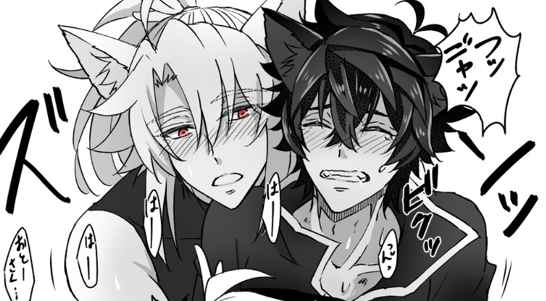 原稿中にラフだけ描いてたワンニャン槍盾仕上げました^^ワンコの槍が興奮しすぎて限界って感じのやつです^^
