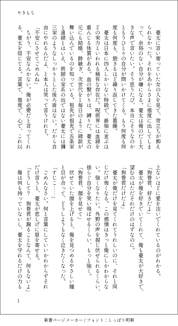 to_tori_ss☆quiet followDOODLEワンドロワンライ「やきもち」のいぬまき君視点。ゆうた大大大好き激重いぬまき君。けっこう喘ぎます(ちょっと濁点) show all(+4 images) Tap to full screen (size:618x1132).Repost is prohibited Let's send reactions! freqpopularsnackothersPayment processing Replies from the creator Follow creator you care about!☆quiet follow to_tori_ssDONE夏の乙棘利き字書きという素敵な企画に参加させていただき、熱帯夜をテーマに書いたお話です。普段と違う試みをしたりして、とても楽しく書きました!原作準拠した欠損の描写があります。 9 to_tori_ssDONEゆうたお誕生日おめでとう🎂💐片腕をなくして喉もだめになり呪術師をやめたとげくんがゆうたの子どもを産んだ世界線のお話です。ゆうたは四十路です。俺得注意⚠️ 5 to_tori_ssDOODLE👹🥜の乙棘です。タイトルは笑うところです。ゆうたの🍌が大好きなとげくんが好きです。18↑? 7 to_tori_ssDONE休暇を取る大人乙棘のはなし。いぬまきくんが普通に喋ります。 6 to_tori_ssSPOILERゆうたおかえり!生きててよかった!記念⚠️269話ネタバレに配慮していません諸々まだ咀嚼中なんですが、こういうのは書いておきたいよね、という話。成人ですか? 5 to_tori_ssDONE🐶くん視点→💍視点⚠️🐶くんが呪言を忘れて喘ぎまくる⚠️けっちょう責め 7 recommended works shiro_pigeonMOURNING第53回 #乙棘版ワンドロワンライお題『手紙』喧嘩からの仲直りです♪ 1323 ottg_0630DOODLE乙棘版ワンドロワンライ「扇風機」とある夏休み中の任務終わり。駅に向かうバスを待つ憂太と棘がついに一線を超えちゃう…?!お話。前々回?のテーマ「夏色」の続きの設定です。 1118 shiro_pigeonMOURNING第74回#乙棘版ワンドロワンライ大遅刻!お題『扇風機』+20min付き合っていない二人です。 4 maakoDONE楽描き芥敦:ク◯ダサTシャツ真剣勝負 2 MeguminDONE #乙棘版ワンドロワンライお題 「聖夜」「悪戯」過去お題をリメイクしました。言わせたかったんです🥺🫶❤️成人ですか?(y/n) 4 ぱくちひ/天の介TRAINING乙棘ドロ、お題「ギリギリ」で描いたやつ。ぬるいですが🍌出てるので18↑で🙏Q.18↑? →yes/no さーもんDOODLE⚠︎顔、r18、現パロ、歳の差(成人済)、独自設定あり庭マリ初夜、何気に自カプの初夜をちゃんと描いたの初めてなのでちょっと当時の気持ちを原稿の上に書き出してみました。※文章は脳直です。ちょいちょい口が悪いです。※あくまで私の精神なので自己満もしてるし自キャラに興奮して気持ち悪いです。※本当にご自衛お願いします。。。パス:汝、なんでも許せる猛者侍也?(yes/no) 30 teaPROGRESS憧れてたミュシャ風かきかき☺️新年までに間に合………わ…s 🥗/swrDOODLE※R18(NSFW)ぶらぼ 月狩イチャイチャしてるやつ(2024/12/30) 3