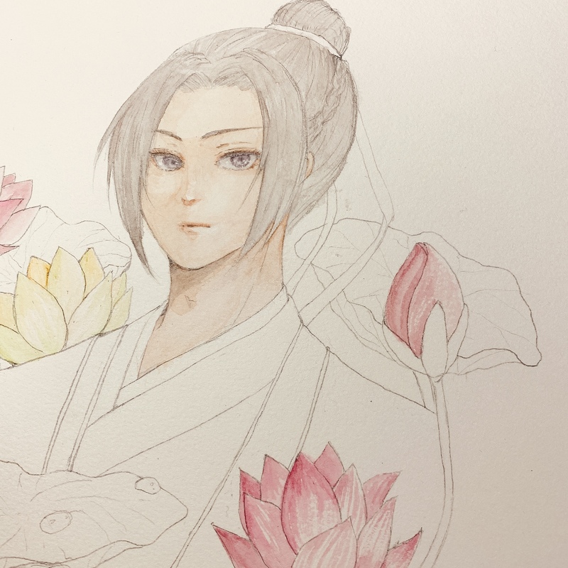 江澄の右手の後ろに蓮の花が見える気がしました。フラワーバスですか。ちょっと見えすぎじゃないでしょうか。江宗主。大丈夫ですか。いろいろと。