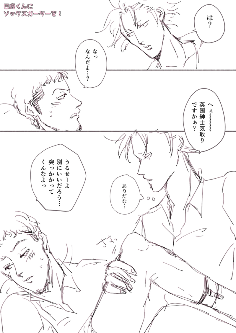 資料集めしながらソックスガーター(靴下留め)姿の海の向こうの男性を見つけ、「ありだな」って思ったのでつい。その割にはちゃんと描かないという……難しいからほら。