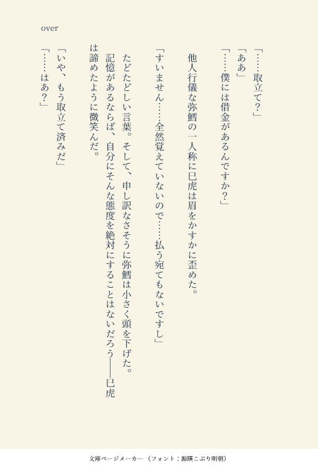 今日の診断メーカー遊び。みだみとパラレル、記憶喪失×取立て屋のリハビリSSです。ただ思いついた文章を打ち込んだだけなので、中身のないそれっぽい雰囲気のぺっらぺらな何かです。ようやく付き合いだしたみだみとちゃんとかだったら、ちょと萌えますね。ちゃんみだから猛アタックを受け続けた末、ようやく付き合いだした矢先――とかね。取り立て過ぎたんだよ、きっとたぶん、巳虎くんは。そういうことにしといて……。