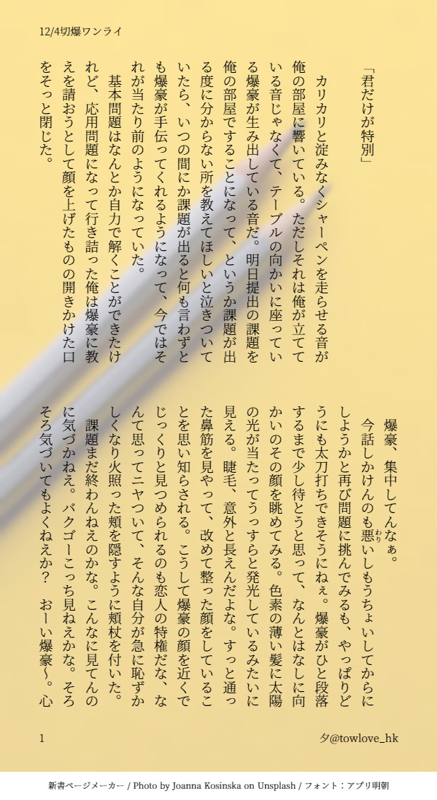 towlove_hk☆quiet followDONE2/13キリバキ再録切爆ワンライ(お題:俺を見て)「君だけが特別」 #爆豪勝己 #切島鋭児郎 akiroKashima #切爆 cutOff #ワンライ oneLai show all(+1 images) Tap to full screen (size:618x1132).Repost is prohibited Let's send reactions! freqpopularsnackothersPayment processing Replies from the creator Follow creator you care about!☆quiet follow towlove_hkDONE2/13キリバキ再録切爆ワンライ(お題:二人分)「拠る所」プロヒ・仲間の死ネタなのでちょっと暗いです。閲覧注意。 2 towlove_hkDONE2/13キリバキ再録切爆ワンライ(お題:俺を見て)「君だけが特別」 2 towlove_hkDONE2/13キリバキ再録切爆ワンドロお題『ぎゅっ』 towlove_hkDONE切爆年賀状🎍だるまっちゃんとだるしまくん☺️ towlove_hkDOODLEかっちゃん模写とらくがき 2 towlove_hkPASTこれまでのツイッターのアイコンまとめ 5 related works 柑橘的な何かDOODLE自動着色すごひ haruta1027PROGRESS終わらないデジタル……難しす……一応ヒロアカ……🙋 ひらがないさなDOODLEかっちゃんを描き始めた頃の落書き。 みさきINFO1/13 インテ 出番15 4号館エ41bのお品書きです。予定しておりました勝デク新刊は落としてしまいました・・・。5月のスパコミに合わせます・・・(;'∀')当日はよろしくお願いします。 riverDOODLE 塩の味DONEかっちゃん初描き pomnee10 ぽむこDOODLEちょっと溜まったのでup🙏🏻🍮1枚目目の前にいるメイド出久くんが可愛すぎてガン見してるかっちゃん描きました血走りww 6 ひらがないさなPAST最初に何をアップしようかなと迷ったんだけど、まずは爆豪君から riverMAIKING下描き recommended works yoneichigo1101DOODLE前Twitterの方で載せたもの…#ヒロアカ #緑谷出久 #爆豪勝己 #MHA幼馴染 ゆず123DOODLEお題「無表情」 炭酸水DOODLE初描きと落書き3枚目は捏造プロヒデクくん 3 きしもとPAST色合いが好きだったやつです 映画は最高すぎて3回見ました m_g_iDOODLE江派(おもに桑名くん)まとめ。汚くてすみません。最後の絵は松井くんを手に入れたら松井くん足してキレイキレイして再度あげたいです(願望 追加・少しだけキレイキレイした 4 mgtyTIRED随分前にラフで遊んだもの すいりDOODLE【注意】.5ネタ入ってます。rkgk風呂上がり、宇宙猫になる堀川くん。歌合を観ちゃった兼さんが、まだミュを観たことがない国広の理解を超える、の巻。 2 me2fullDOODLEちょっと物騒な彼が好きです さとう🎀PAST12月堀川まとめ② 4