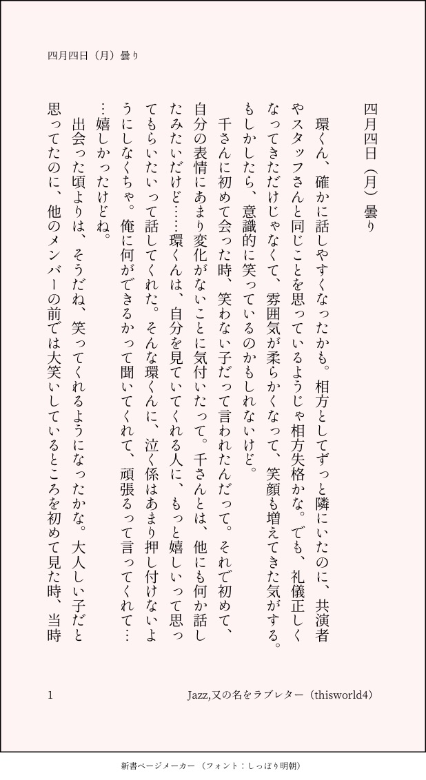 こうみ☆quiet followMEMO他のメンバーの前では大笑いしているところを初めて見た時、当時はあまり考えないようにしていたけど、やっぱりショックだったな……。 ##日記本 show all(+1 images) Tap to full screen (size:618x1132).Repost is prohibited Let's send reactions! freqpopularsnackothersPayment processing Replies from the creator Follow creator you care about!☆quiet follow こうみDONE死に方を決めること 4 こうみDONEキャットウォークをつたう夜 8 こうみValentineデートはひと月後の予定 3 こうみDONE重ねた温度でうそを守って(環壮)5部配信分後の夜 3 こうみHappy New Yearステージの上で待ち合わせ(環壮) 3 こうみDONElifeis 露天風呂 2 recommended works りこたMOURNINGオリキャラ作成 ……の残骸 笑Twitter▶️@ricottacomic komehazesukiMOURNINGアルジュナくんが描けない あさき🐙MOURNINGかなり前に描いた、ナチュラルに壁ドンしてるところ描きたかったんだけど背景どうしようってなって放置してるうちに忘れ去ってたオルサイを発掘したのでついでにポイポイしときますw壁ドン絵はまた改めて描きたいですね!! こうみMEMO他のメンバーの前では大笑いしているところを初めて見た時、当時はあまり考えないようにしていたけど、やっぱりショックだったな……。 2 こうみMEMO環くんのモノマネ、全然違うって言われてしまったけど、まだ観察が足りないかな……? 2 こうみMEMO食べ物がたくさん出てくる撮影だったからかな、環くんが終始子犬みたいな眼をしてた。 2 こうみMEMO環くんは、ただの水だと減りが遅い。 こうみMEMO こうみMEMO環くんも、昨日は取り乱していたけど、ライブの最後は手をつないで、笑ってくれた。