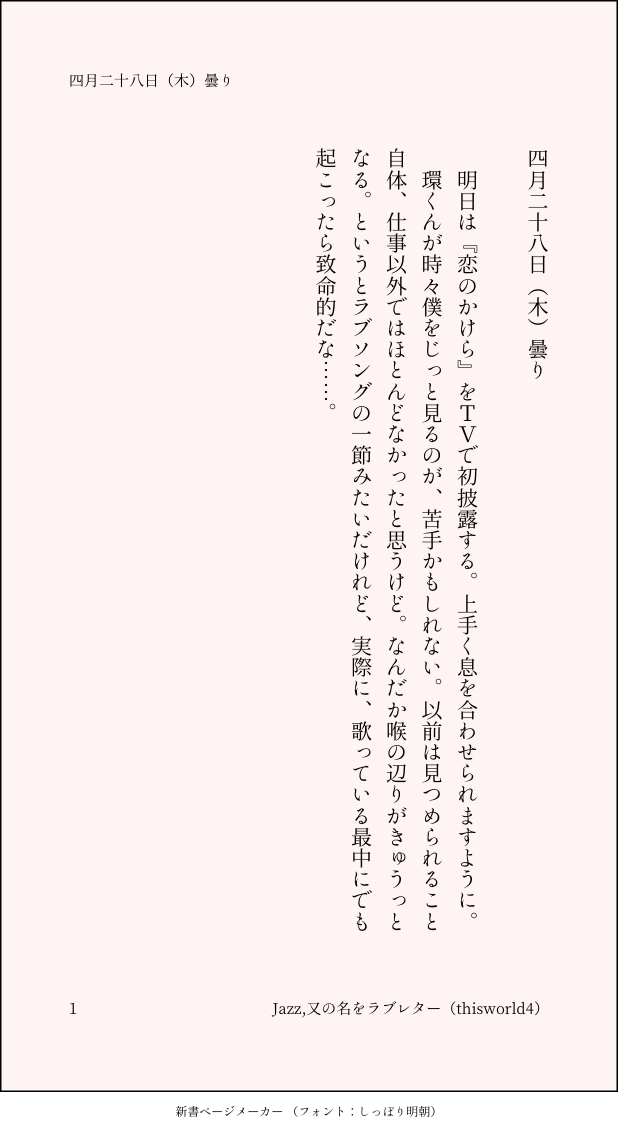 こうみ☆quiet followMEMO環くんが時々僕をじっと見るのが、苦手かもしれない。 ##日記本 Tap to full screen (size:618x1132).Repost is prohibited Let's send reactions! freqpopularsnackothersPayment processing Replies from the creator Follow creator you care about!☆quiet follow こうみDONE死に方を決めること 4 こうみDONEキャットウォークをつたう夜 8 こうみValentineデートはひと月後の予定 3 こうみDONE重ねた温度でうそを守って(環壮)5部配信分後の夜 3 こうみHappy New Yearステージの上で待ち合わせ(環壮) 3 こうみDONElifeis 露天風呂 2 recommended works 10♦︎PASTポケモン、ゼルダ。 3 03atCELLDOODLEらくがき供養 こうみMEMOこないだ環くんを起こしに部屋へ行ったら、上半身裸で、こないだあげた腹巻きだけしてた。 こうみMEMO こうみMEMO僕一人じゃ無理だからってだけの、ただのわがままなのかな。だけど一緒にいてほしい。ごめんね。 こうみMEMO環くんも、昨日は取り乱していたけど、ライブの最後は手をつないで、笑ってくれた。 こうみMEMOうさみみフレンズパークとのコラボ企画会議に、久々に出席しました。 こうみMEMOすぐそばにいるはずなのに遠いのと、今みたいに物理的に離れているのとでは、やっぱり前者のほうが強烈に寂しさを感じるものなのかな。 2 こうみMEMO僕からのキスは、優しいんだそうです。 2
