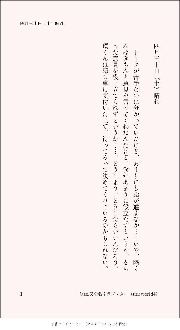 こうみ☆quiet followMEMO環くんは隠し事に気付いた上で、待ってるって決めてくれているのかもしれない。 ##日記本 Tap to full screen (size:618x1132).Repost is prohibited Let's send reactions! freqpopularsnackothersPayment processing Replies from the creator Follow creator you care about!☆quiet follow こうみDONE死に方を決めること 4 こうみDONEキャットウォークをつたう夜 8 こうみValentineデートはひと月後の予定 3 こうみDONE重ねた温度でうそを守って(環壮)5部配信分後の夜 3 こうみHappy New Yearステージの上で待ち合わせ(環壮) 3 こうみDONElifeis 露天風呂 2 recommended works Capricorn_nkMOURNING真っ青な我が師も捨てがたかった 遥海描 三郷MOURNING比叡発見記念に。おかえりなさい、比叡。 みちゅちゅMOURNING供養なり。供養なので自由に使ってあげてください(使わない) 7 gargantuapocketMOURNINGどんだけいじくっても気に入らないからここで終了 こうみMEMO環くんのモノマネ、全然違うって言われてしまったけど、まだ観察が足りないかな……? 2 こうみMEMOジャケットは、僕も環くんも「こんな顔もできるんだ」ってちょっとくすぐったい褒められ方をした一枚です。 こうみMEMO今度はなくさないでくれるといいな。 フジタロスDOODLEコハクちゃん😘加工前の こうみMEMO『月明かりイルミネイト』を歌うと二人とも声が揺れてしまうので、MEZZO"揃っての歌レッスンはしばらくお休みします。 2