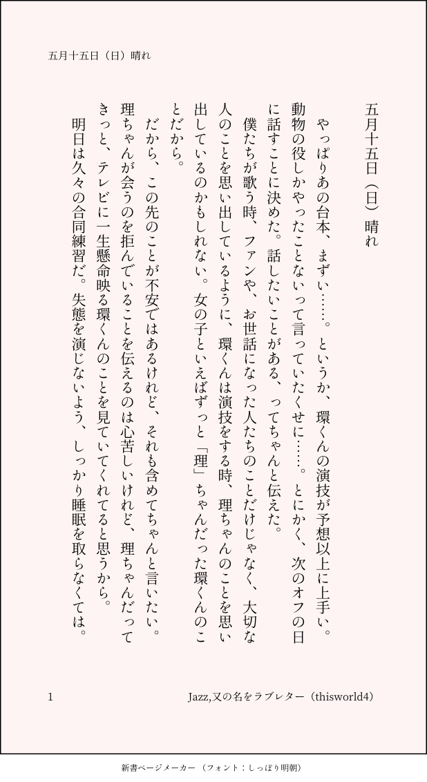 こうみ☆quiet followMEMOとにかく、次のオフの日に話すことに決めた。話したいことがある、ってちゃんと伝えた。 ##日記本 Tap to full screen (size:618x1132).Repost is prohibited Let's send reactions! freqpopularsnackothersPayment processing Replies from the creator Follow creator you care about!☆quiet follow こうみDONE死に方を決めること 4 こうみDONEキャットウォークをつたう夜 8 こうみValentineデートはひと月後の予定 3 こうみDONE重ねた温度でうそを守って(環壮)5部配信分後の夜 3 こうみHappy New Yearステージの上で待ち合わせ(環壮) 3 こうみDONElifeis 露天風呂 2