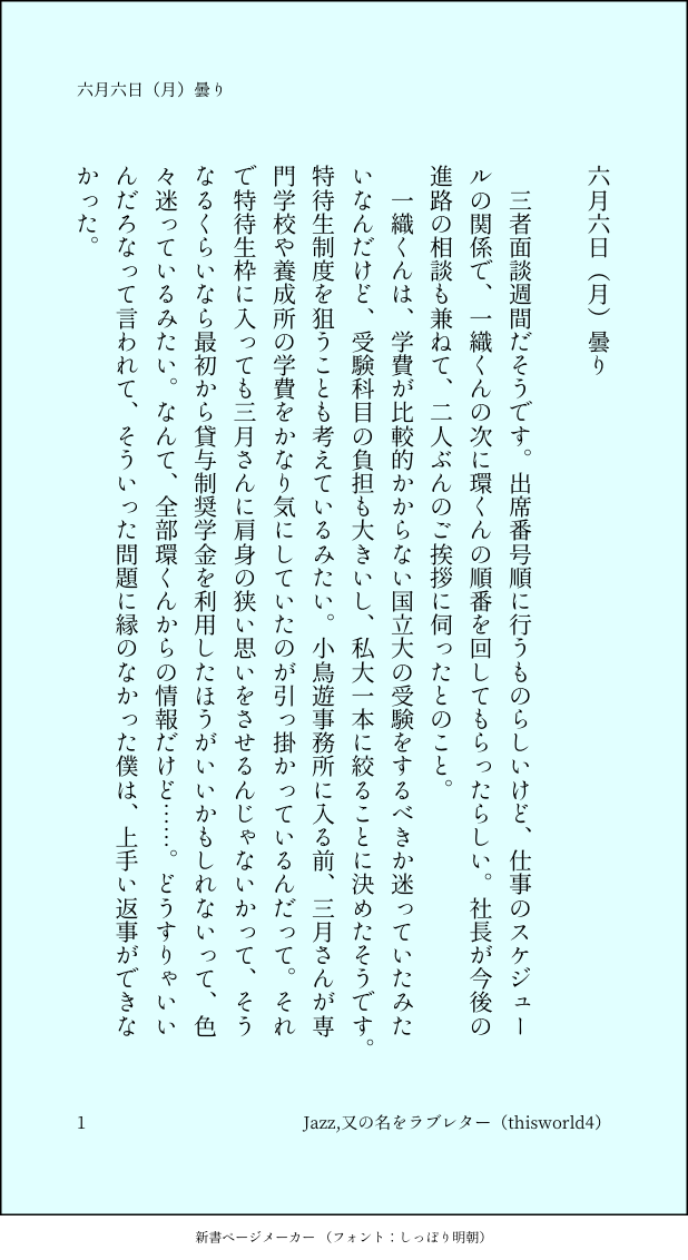 こうみ☆quiet followMEMO三者面談週間だそうです。出席番号順に行うものらしいけど、仕事のスケジュールの関係で、一織くんの次に環くんの順番を回してもらったらしい。社長が今後の進路の相談も兼ねて、二人ぶんのご挨拶に伺ったとのこと。 ##日記本 show all(+1 images) Tap to full screen (size:618x1132).Repost is prohibited Let's send reactions! freqpopularsnackothersPayment processing Replies from the creator Follow creator you care about!☆quiet follow こうみDONE死に方を決めること 4 こうみDONEキャットウォークをつたう夜 8 こうみValentineデートはひと月後の予定 3 こうみDONE重ねた温度でうそを守って(環壮)5部配信分後の夜 3 こうみHappy New Yearステージの上で待ち合わせ(環壮) 3 こうみDONElifeis 露天風呂 2 recommended works やすみ先生MOURNINGともだちのコンシェルジュです。同じ顔のはずなのにかなりかっこいい。#私のセイ #MakeSお絵描き #供養 Capricorn_nkMOURNING真っ青な我が師も捨てがたかった ⑅·*❁¨̮❁*·⑅MAIKINGカービィ落書き。アナログ描きかけからデジタル途中詰め3枚。よく分からないものが出来ました(汗)綺麗に描けなくて毎回挫折。デジ絵初心者の為エフェクト等素材が豊富すぎて全く使いこなせません(´;ω;`) 3 こうみMEMO環くんは、野菜の皮を剥くのが上手くなったね。練習させた甲斐があったな。 2 こうみMEMO今度はなくさないでくれるといいな。 こうみMEMO僕は父の決めた大学の中から選んでしまったから、一織くんの相談にはあまり乗ってあげられないかも。 こうみMEMO環くんは、国語はたぶん得意なのに、僕の話が下手なんだろうか……物事を一つ伝えるのに時間がかかりすぎて、環くんが余計に疲れてしまう。 こうみMEMO僕は、どんなに環くんを大事に思っていても、いつか「幸せになって」と言って、環くんから離れていくんだって。 こうみMOURNING遊覧船