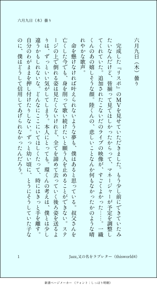 こうみ☆quiet followMEMO環くんの考えは、僕とは少し違うかもしれないな。どんなにここにいてほしくたって、時にはきっと手を離す。自分のわがままを押し付けたりしない。 ##日記本 show all(+1 images) Tap to full screen (size:618x1132).Repost is prohibited Let's send reactions! freqpopularsnackothersPayment processing Replies from the creator Follow creator you care about!☆quiet follow こうみDONE死に方を決めること 4 こうみDONEキャットウォークをつたう夜 8 こうみValentineデートはひと月後の予定 3 こうみDONE重ねた温度でうそを守って(環壮)5部配信分後の夜 3 こうみHappy New Yearステージの上で待ち合わせ(環壮) 3 こうみDONElifeis 露天風呂 2 recommended works ちぇりあMOURNINGアナログ線画お絵描き(2枚目は色塗りしようと思って力尽きたやつ) 3 こうみMEMOなんだか、MEZZO"が一足先にデビューした頃のことを思い出す。 2 こうみMEMO環くんは「女の子」といえば理ちゃんなんだなあ。 2 こうみMEMO環くんには、僕には分からないような僕の気持ちも、分かってしまうのかな……。 こうみMEMO人の健康を心配している場合ではない……? こうみMEMO二人が一緒に暮らせる日が来るまで、僕が誰よりも一番そばにいて、環くんのことを見ているって、約束します。 2 こうみMEMOどうしても気になるので、今日は環くんの部屋で寝ようかな。布団はちゃんと持参します。 2 こうみMEMO環くんが「どうせ顔に出んなら俺と読み合わせたほうがマシじゃん」って言ってのけたのが、本当に頭に来る。人の気も知らないで……! こうみMOURNINGイヤモニのやつ 2