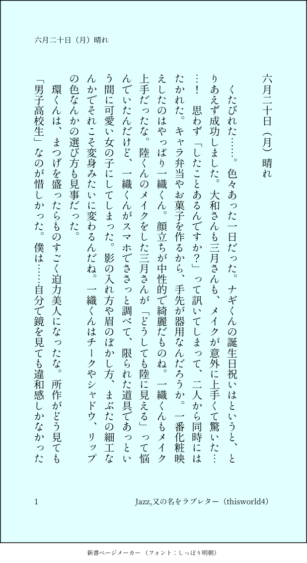 こうみ☆quiet followMEMOナギくんは……ビデオ通話で話し始めたら、やっぱり泣いてしまった。明日式典に出るのに困るって言いながらすごく泣いてた。 ##日記本 show all(+3 images) Tap to full screen (size:618x1132).Repost is prohibited Let's send reactions! freqpopularsnackothersPayment processing Replies from the creator Follow creator you care about!☆quiet follow こうみDONE死に方を決めること 4 こうみDONEキャットウォークをつたう夜 8 こうみValentineデートはひと月後の予定 3 こうみDONE重ねた温度でうそを守って(環壮)5部配信分後の夜 3 こうみHappy New Yearステージの上で待ち合わせ(環壮) 3 こうみDONElifeis 露天風呂 2 recommended works Capricorn_nkMOURNING前に描いたアルバさまの色なし komehazesukiMOURNINGアルジュナくんが描けない こうみMEMO末年始は何かとバタつくので、四月始まりにしました。昨年こそきちんと日記をつけておけばよかった。 2 こうみMEMO他のメンバーの前では大笑いしているところを初めて見た時、当時はあまり考えないようにしていたけど、やっぱりショックだったな……。 2 こうみMEMOまだ急に冷え込むこともあるから出しておきたいけれど、暖かいと誰かさんが蹴っ飛ばして、かえって薄着になってしまうからなあ。 こうみMEMO帰宅するなりソファーで眠ってしまって、起こせなかった。ジャージをかぶって、小雨の中走ってきたみたい。 こうみMEMO こうみMEMO環くんが仕事前にくれたレモンキャンディ。口の中ですぐほろほろっと溶けた。 こうみMEMO「一番悲しいのはナギなのに」って泣いちゃった陸くんを、環くんが居間で一生懸命慰めてる……。 2