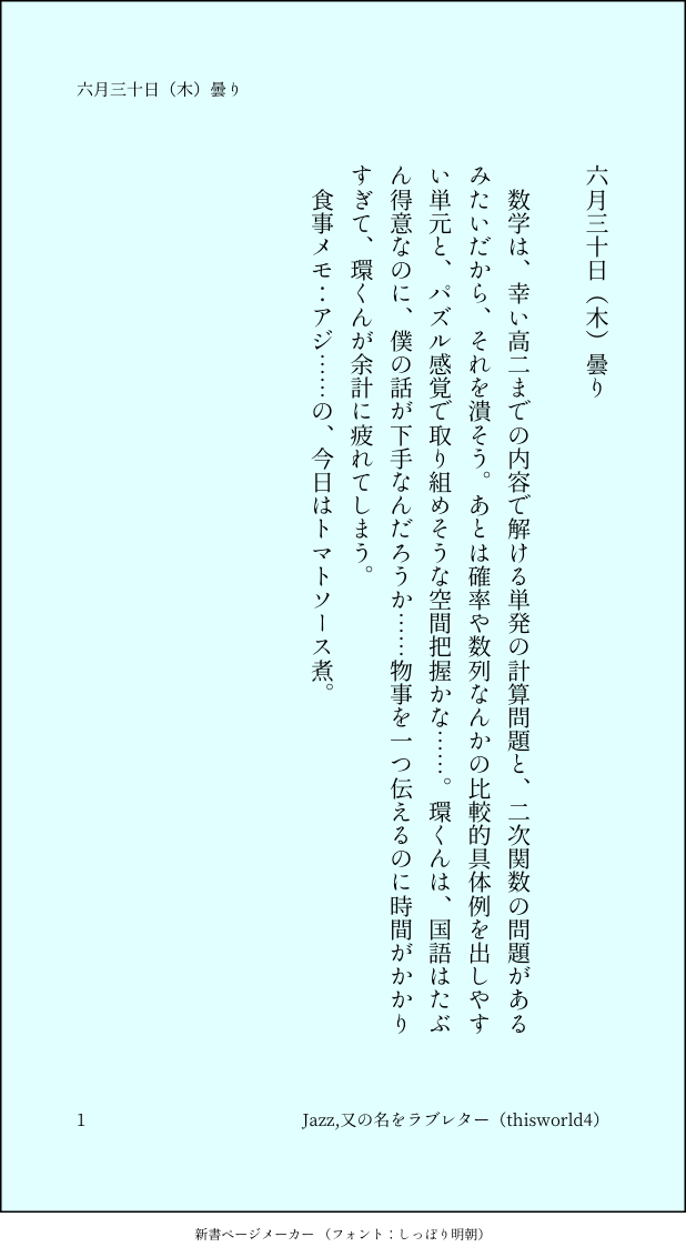 こうみ☆quiet followMEMO環くんは、国語はたぶん得意なのに、僕の話が下手なんだろうか……物事を一つ伝えるのに時間がかかりすぎて、環くんが余計に疲れてしまう。 ##日記本 Tap to full screen (size:618x1132).Repost is prohibited Let's send reactions! freqpopularsnackothersPayment processing Replies from the creator Follow creator you care about!☆quiet follow こうみDONE死に方を決めること 4 こうみDONEキャットウォークをつたう夜 8 こうみValentineデートはひと月後の予定 3 こうみDONE重ねた温度でうそを守って(環壮)5部配信分後の夜 3 こうみHappy New Yearステージの上で待ち合わせ(環壮) 3 こうみDONElifeis 露天風呂 2