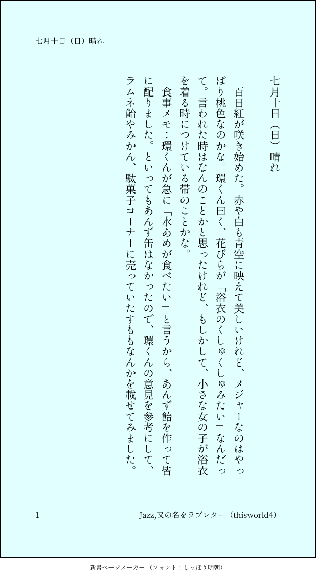 こうみ☆quiet followMEMO環くん曰く、花びらが「浴衣のくしゅくしゅみたい」なんだって。 ##日記本 Tap to full screen (size:618x1132).Repost is prohibited Let's send reactions! freqpopularsnackothersPayment processing Replies from the creator Follow creator you care about!☆quiet follow こうみDONE死に方を決めること 4 こうみDONEキャットウォークをつたう夜 8 こうみValentineデートはひと月後の予定 3 こうみDONE重ねた温度でうそを守って(環壮)5部配信分後の夜 3 こうみHappy New Yearステージの上で待ち合わせ(環壮) 3 こうみDONElifeis 露天風呂 2 recommended works もぴおMOURNING描いてたけどいまいちだったから👋 こうみMEMO環くんは、明日の立ち位置はほぼずっと端だから目立たないだろうけれど、やっぱり隣の僕が一歩前に出て、動きを抑えたほうがいいのかな。 こうみMEMO一織くんと学力テストの勉強をするって言うから、ホットミルクだけ差し入れて出てきてしまった。 こうみMEMO今回は十代の子たちが色々抱えているし、大人の僕たちがしっかりしなくちゃ。 こうみMEMO二十一歳になりました。 3 こうみMEMO受験勉強に臨む一織くんの負担を軽減できないか、大和さんに相談しようと思っていたら、環くんが先に、食卓の席でサクッと話題に上げてしまった。 こうみMEMO環くんは正式には帰宅部という扱いだから、ほとんどの競技で得点王っぷりを見せつけてきたらしい。クラス対抗リレーなんか、アンカーで四人抜きだって。 2 こうみMEMOさて、期末テストの科目を見直してみたけれど、現代文はおおむね大丈夫だね。古典は鉛筆を転がして運が良ければというところだね。数学はいずれもダメです。 2 taaaaaadanoMOURNING久々にちゃんと色を塗った気がしたので…せっかくなので…