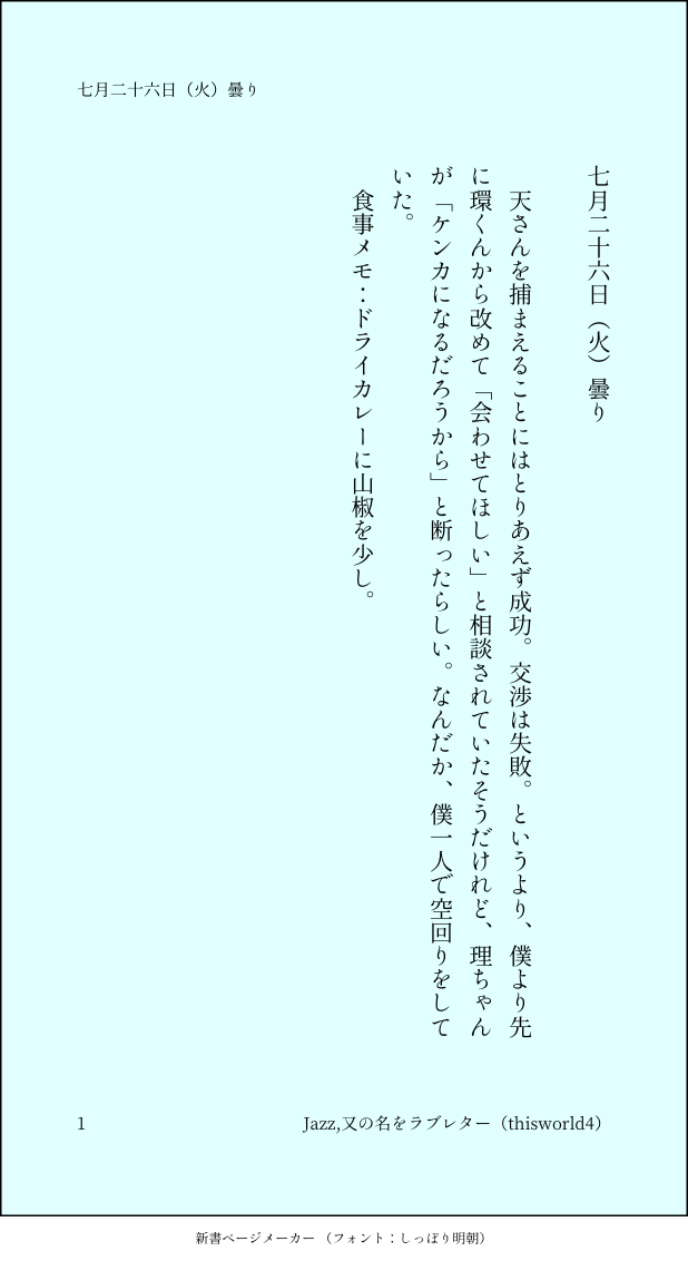 こうみ☆quiet followMEMOなんだか、僕一人で空回りをしていた。 ##日記本 Tap to full screen (size:618x1132).Repost is prohibited Let's send reactions! freqpopularsnackothersPayment processing Replies from the creator Follow creator you care about!☆quiet follow こうみDONE死に方を決めること 4 こうみDONEキャットウォークをつたう夜 8 こうみValentineデートはひと月後の予定 3 こうみDONE重ねた温度でうそを守って(環壮)5部配信分後の夜 3 こうみHappy New Yearステージの上で待ち合わせ(環壮) 3 こうみDONElifeis 露天風呂 2 recommended works 遥海描 三郷MOURNING比叡発見記念に。おかえりなさい、比叡。 10♦︎PASTポケモン、ゼルダ。 3 百瀬あんMOURNING手が逆だったので供養 こうみMEMO一織くんは学校でいつも環くんと一緒にいるわけで、僕の知らない環くんのことも、たくさん見ているんだよね。 こうみMEMO海沿いはまだ肌寒いと思ってたのに、セミダブルサイズのベッドで添い寝されると、やっぱり暑い。 2 こうみMEMO環くんは隠し事に気付いた上で、待ってるって決めてくれているのかもしれない。 こうみMEMO痛みよりも、音のほうに驚くね。何度も肩を打たれてしまって恥ずかしかったな。 2 こうみMEMO十分楽しみにして入場したつもりだったけど、環くんに「ちゃんと楽しめ」って小突かれた。 こうみMEMO全科目の平均点が三十点以上なら追試だけは免除にしてもらえないかとか……無理か……。