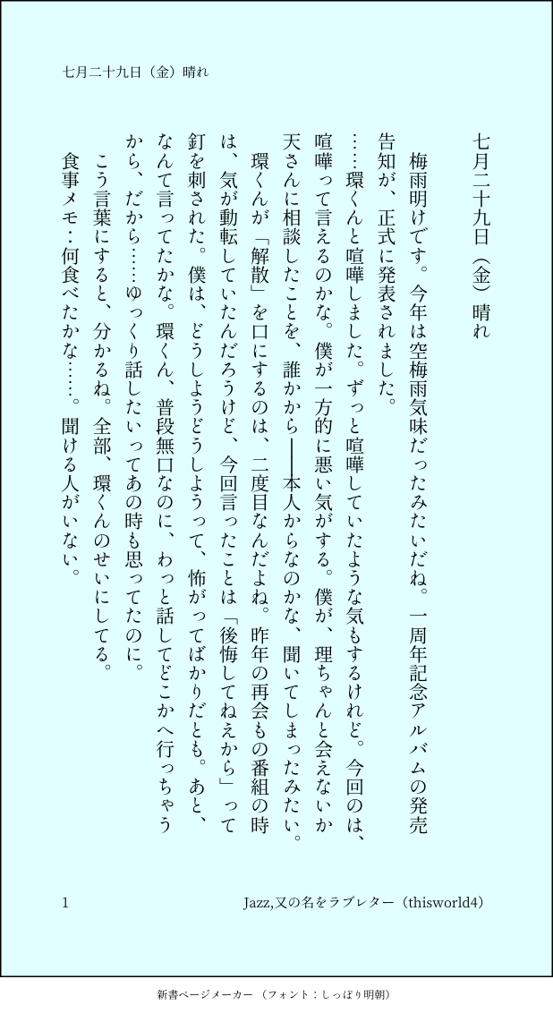 こうみ☆quiet followMEMOこう言葉にすると、分かるね。全部、環くんのせいにしてる。 ##日記本 Tap to full screen (size:618x1132).Repost is prohibited Let's send reactions! freqpopularsnackothersPayment processing Replies from the creator Follow creator you care about!☆quiet follow こうみDONE死に方を決めること 4 こうみDONEキャットウォークをつたう夜 8 こうみValentineデートはひと月後の予定 3 こうみDONE重ねた温度でうそを守って(環壮)5部配信分後の夜 3 こうみHappy New Yearステージの上で待ち合わせ(環壮) 3 こうみDONElifeis 露天風呂 2 recommended works gargantuapocketMOURNINGどんだけいじくっても気に入らないからここで終了 はすねこMOURNING玲ちゃん練習描いてるうちに、段々玲ちゃんなのか玲ちゃんじゃないのかわからなくなったので、全消しアニメ玲ちゃんとスタマイ玲ちゃん何度も見比べてるんだけどな… こうみMEMO環くんは、野菜の皮を剥くのが上手くなったね。練習させた甲斐があったな。 2 こうみMEMO環くんには、僕には分からないような僕の気持ちも、分かってしまうのかな……。 こうみMEMO環くんは、ただの水だと減りが遅い。 こうみMEMO環くんも、昨日は取り乱していたけど、ライブの最後は手をつないで、笑ってくれた。 こうみMEMOどうしても気になるので、今日は環くんの部屋で寝ようかな。布団はちゃんと持参します。 2 こうみMEMO僕は、どんなに環くんを大事に思っていても、いつか「幸せになって」と言って、環くんから離れていくんだって。 こうみMEMO本当はテスト期間中一度くらい、環くんが僕の部屋に勉強しに来ないかなって思ってた。