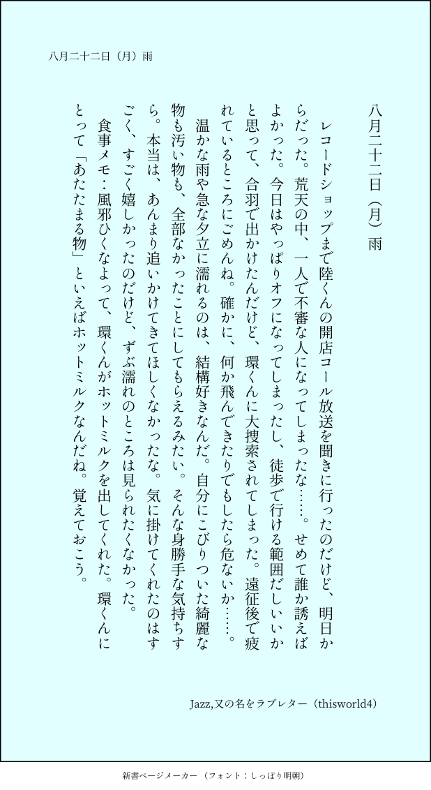こうみ☆quiet followMEMO本当は、あんまり追いかけてきてほしくなかったな。気に掛けてくれたのはすごく、すごく嬉しかったのだけど、ずぶ濡れのところは見られたくなかった。 ##日記本 Tap to full screen (size:618x1132).Repost is prohibited Let's send reactions! freqpopularsnackothersPayment processing Replies from the creator Follow creator you care about!☆quiet follow こうみDONE死に方を決めること 4 こうみDONEキャットウォークをつたう夜 8 こうみValentineデートはひと月後の予定 3 こうみDONE重ねた温度でうそを守って(環壮)5部配信分後の夜 3 こうみHappy New Yearステージの上で待ち合わせ(環壮) 3 こうみDONElifeis 露天風呂 2 recommended works mogmogaskMOURNING供養 おちゃっぱ。MOURNINGガチャ引くの忘れた😂 gargantuapocketMOURNINGどんだけいじくっても気に入らないからここで終了 こうみMEMOお腹を大事にしてくれと伝えたら、「ホントに腹筋好きだよな」と返ってきた。そういうことじゃない。 こうみMEMO環くんには、僕には分からないような僕の気持ちも、分かってしまうのかな……。 こうみMEMOグラビアの撮影中、環くんがやたら僕を後ろ向きにさせるなと思ったら、隈がひどいんだ。 こうみMEMO人を失う悲しみを知らないつもりではないけれど、一人っ子で、一人で育ったから、環くんのことも、正しく思い遣れなかったんだろうか。 2 こうみMEMO失礼を承知で、環くんの進路について、社長に伺いに上がりました。ごめんなさい。結論からいうと、環くんはアイドルを本業にすることを考えているそうだった。 2 こうみMEMO今年は青がベースカラーなんだね。「赤似合わないからこっちのがいい」って言ってたけど、去年のサンタ衣装もちゃんと似合ってたよ。