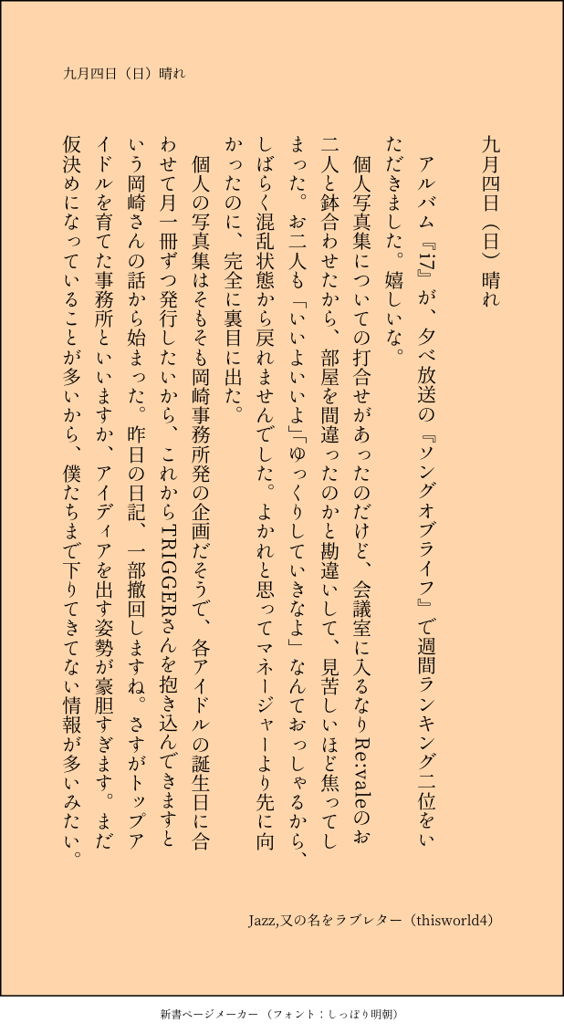 こうみ☆quiet followMEMOアルバム『i7』が、夕べ放送の『ソングオブライフ』で週間ランキング二位をいただきました。嬉しいな。 ##日記本 show all(+1 images) Tap to full screen (size:618x1132).Repost is prohibited Let's send reactions! freqpopularsnackothersPayment processing Replies from the creator Follow creator you care about!☆quiet follow こうみDONE死に方を決めること 4 こうみDONEキャットウォークをつたう夜 8 こうみValentineデートはひと月後の予定 3 こうみDONE重ねた温度でうそを守って(環壮)5部配信分後の夜 3 こうみHappy New Yearステージの上で待ち合わせ(環壮) 3 こうみDONElifeis 露天風呂 2 recommended works りこたMOURNINGオリキャラ作成 ……の残骸 笑Twitter▶️@ricottacomic gargantuapocketMOURNING諸々の理由でこっちに。気が向いたらなんか考える。 ORE_NO_IMOURNINGこないなと思ってたらガチャ来た Bee@beepnpnDOODLE変顔じゃないから中々善逸君に見えないですね…! こうみMEMO こうみMEMO人を失う悲しみを知らないつもりではないけれど、一人っ子で、一人で育ったから、環くんのことも、正しく思い遣れなかったんだろうか。 2 こうみMEMO僕は父の決めた大学の中から選んでしまったから、一織くんの相談にはあまり乗ってあげられないかも。 こうみMEMO明後日はスイーツバイキングの店員さんなんだから、あまり目を腫らさないでほしい……。 こうみMEMO環くんだって、十さんと同じように、一番大事な家族のそばで暮らすことよりも、その家族のためにできることを選んでいるでしょう。理ちゃんのためにずっと貯金しているのを、僕はちゃんと知ってるんだよ。 2