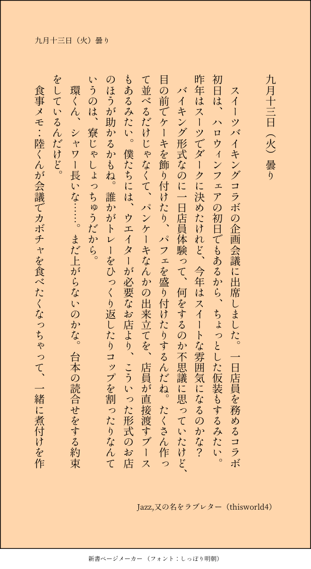 こうみ☆quiet followMEMOスイーツバイキングコラボの企画会議に出席しました。一日店員を務めるコラボ初日は、ハロウィンフェアの初日でもあるから、ちょっとした仮装もするみたい。 ##日記本 show all(+1 images) Tap to full screen (size:618x1132).Repost is prohibited Let's send reactions! freqpopularsnackothersPayment processing Replies from the creator Follow creator you care about!☆quiet follow こうみDONE死に方を決めること 4 こうみDONEキャットウォークをつたう夜 8 こうみValentineデートはひと月後の予定 3 こうみDONE重ねた温度でうそを守って(環壮)5部配信分後の夜 3 こうみHappy New Yearステージの上で待ち合わせ(環壮) 3 こうみDONElifeis 露天風呂 2