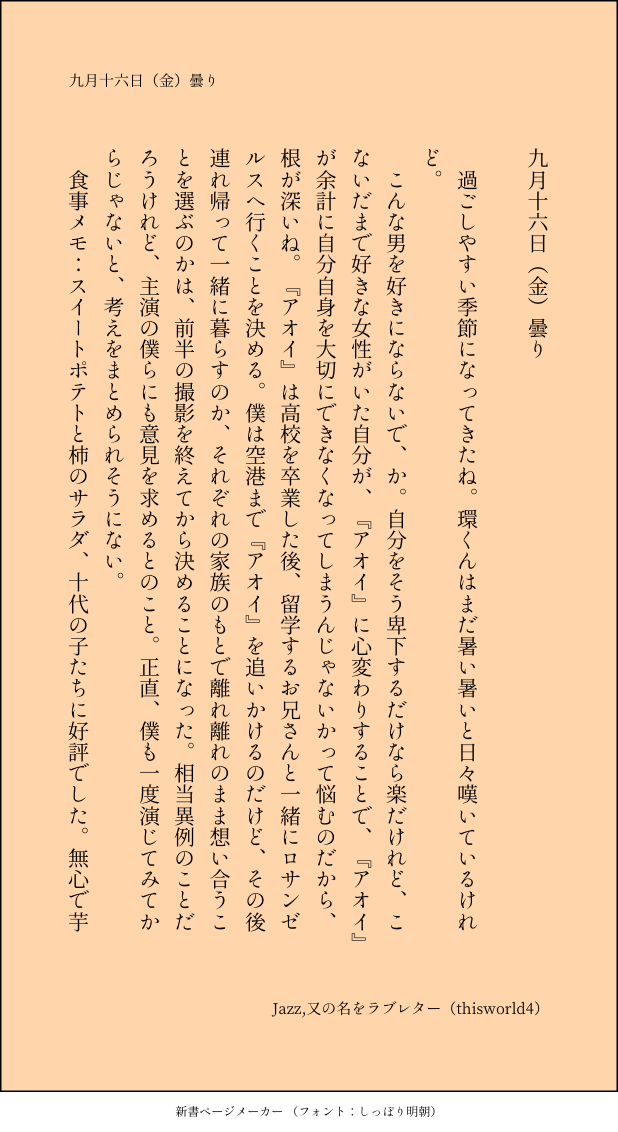 こうみ☆silencio seguirMEMORÁNDUMこんな男を好きにならないで、か。 ##日記本 mostrar todo(+1 imágenes) Toque para pantalla completa (tamaño:618x1132).Está prohibido volver a publicar ¡Mandemos reacciones! frecuenciapopularbocadillootrosProcesando pago Respuestas del creador ¡Sigue al creador que te importa!☆silencio seguir こうみHECHO死に方を決めること 4 こうみHECHOキャットウォークをつたう夜 8 こうみEnamoradoデートはひと月後の予定 3 こうみHECHO重ねた温度でうそを守って(環壮)5部配信分後の夜 3 こうみFeliz año nuevoステージの上で待ち合わせ(環壮) 3 こうみHECHOlifeis 露天風呂 2 obras recomendadas mogmogaskLUTO供養 夢想曲LUTOサークルカットでこの構図が結局ボツになったのでラフだけ描ききって供養。 みちゅちゅLUTO供養なり。供養なので自由に使ってあげてください(使わない) 7 百瀬あんLUTO手が逆だったので供養 こうみMEMORÁNDUM環くんは隠し事に気付いた上で、待ってるって決めてくれているのかもしれない。 こうみMEMORÁNDUM環くんには、僕には分からないような僕の気持ちも、分かってしまうのかな……。 こうみMEMORÁNDUMたった今環くんが、焼く前の王様プリンの写真を送ってくれた……。さっきも見たよ。早く寝てください。 こうみMEMORÁNDUM環くんは許してやるって、あんな奴やっつけてやるって言ってくれたけれど、僕だって今度こそ君のことを守るから。 2 こうみMEMORÁNDUM環くんはあれだけかっこいい体つきをしているのに、どうしてあんなに動物の耳が似合ってしまうんだろうね。