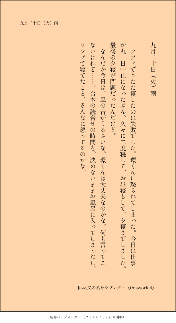 こうみ☆quiet followMEMOソファでうたた寝したのは失敗でした。環くんに怒られてしまった。 ##日記本 Tap to full screen (size:618x1132).Repost is prohibited Let's send reactions! freqpopularsnackothersPayment processing Replies from the creator Follow creator you care about!☆quiet follow こうみDONE死に方を決めること 4 こうみDONEキャットウォークをつたう夜 8 こうみValentineデートはひと月後の予定 3 こうみDONE重ねた温度でうそを守って(環壮)5部配信分後の夜 3 こうみHappy New Yearステージの上で待ち合わせ(環壮) 3 こうみDONElifeis 露天風呂 2 recommended works 1315CAN’T MAKE反転したら地獄だった Capricorn_nkMOURNING前に描いたアルバさまの色なし komehazesukiMOURNINGアルジュナくんが描けない gargantuapocketREHABILI使い残しとか何とか。ナイと思いますが自作発言、二次配布しなければ使用はご自由にどうぞ。ツイ垢→https://twitter.com/gargantuapocket 7 こうみMEMO環くんは隠し事に気付いた上で、待ってるって決めてくれているのかもしれない。 こうみMEMO一織くんと学力テストの勉強をするって言うから、ホットミルクだけ差し入れて出てきてしまった。 にちかろいどTIRED習作。WHRのマネージャーさん?描きました。 こうみMEMOとにかく、次のオフの日に話すことに決めた。話したいことがある、ってちゃんと伝えた。 こうみMEMO去年は追試なんて受けてたかな……? 中間テストは? 僕が知らないだけで受けていたのか? それとも、今年は仕事が忙しいから危ないだけ? 2