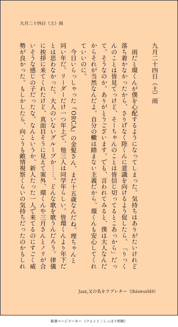 こうみ☆quiet followMEMO「りっくんのことは皆見てっけど、そーちゃんのことは皆信じ切ってるとこあっから」だって。そうなのか。 ##日記本 show all(+1 images) Tap to full screen (size:618x1132).Repost is prohibited Let's send reactions! freqpopularsnackothersPayment processing Replies from the creator Follow creator you care about!☆quiet follow こうみDONE死に方を決めること 4 こうみDONEキャットウォークをつたう夜 8 こうみValentineデートはひと月後の予定 3 こうみDONE重ねた温度でうそを守って(環壮)5部配信分後の夜 3 こうみHappy New Yearステージの上で待ち合わせ(環壮) 3 こうみDONElifeis 露天風呂 2 recommended works komehazesukiMOURNING横顔練習 ⑅·*❁¨̮❁*·⑅MAIKINGカービィ落書き。アナログ描きかけからデジタル途中詰め3枚。よく分からないものが出来ました(汗)綺麗に描けなくて毎回挫折。デジ絵初心者の為エフェクト等素材が豊富すぎて全く使いこなせません(´;ω;`) 3 はすねこMOURNING玲ちゃん練習描いてるうちに、段々玲ちゃんなのか玲ちゃんじゃないのかわからなくなったので、全消しアニメ玲ちゃんとスタマイ玲ちゃん何度も見比べてるんだけどな… こうみMEMO末年始は何かとバタつくので、四月始まりにしました。昨年こそきちんと日記をつけておけばよかった。 2 こうみMEMOキーホルダーのことは今度一緒に食事をとれた時に相談しよう。 こうみMEMO環くんが時々僕をじっと見るのが、苦手かもしれない。 こうみMEMOスマホのフォトフォルダに、環くんの写真がやたらといっぱい入っているんだけど。 こうみMEMO環くん、まだ眠ってるのかな。一人で起きても寂しくないように、ぬいぐるみを置いておいたんだけど。 3 こうみMEMOここなちゃんの衣装は既製品のものを購入したけれど、環くんも大和さんも、背中のファスナーが閉まらない。