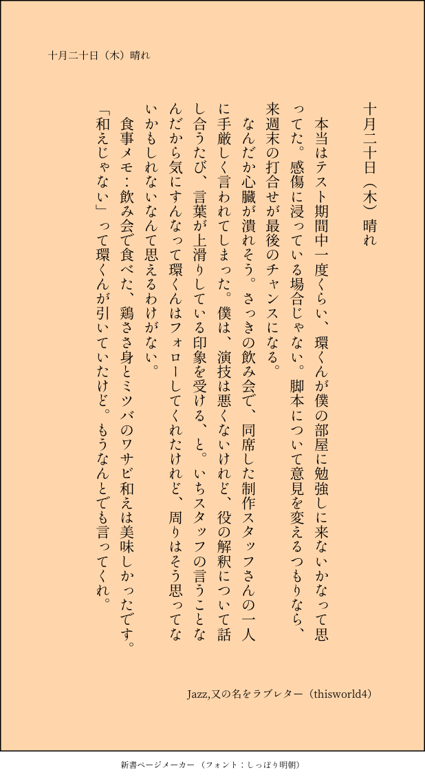 こうみ☆quiet followMEMO本当はテスト期間中一度くらい、環くんが僕の部屋に勉強しに来ないかなって思ってた。 ##日記本 Tap to full screen (size:618x1132).Repost is prohibited Let's send reactions! freqpopularsnackothersPayment processing Replies from the creator Follow creator you care about!☆quiet follow こうみDONE死に方を決めること 4 こうみDONEキャットウォークをつたう夜 8 こうみValentineデートはひと月後の予定 3 こうみDONE重ねた温度でうそを守って(環壮)5部配信分後の夜 3 こうみHappy New Yearステージの上で待ち合わせ(環壮) 3 こうみDONElifeis 露天風呂 2 recommended works こうみMEMO十分楽しみにして入場したつもりだったけど、環くんに「ちゃんと楽しめ」って小突かれた。 こうみMEMO こうみMEMOまだ九月だから「ダンスが全部『miss you...』になってるぞ」なんて笑ってもらえてるけどね。 こうみMEMO今年は青がベースカラーなんだね。「赤似合わないからこっちのがいい」って言ってたけど、去年のサンタ衣装もちゃんと似合ってたよ。 こうみMOURNING何も知らないのに恋してしまった。「付き合う」ってどういうこと? こうみMOURNINGこんまま溶かされて こうみMEMO手の震えも止まらないし、なんだかずっと緊張しているみたい。どんな大舞台でも、こんなことは今までなかったのにな。 2 こうみMEMO「好きなものから離れろと言われたって無理ですよね!」と天使のような微笑みで言い放たれて、諦めて王様プリンマフラーを編みました。 2 こうみMOURNINGそーちゃんはそーちゃんのことをはなから信じてない。