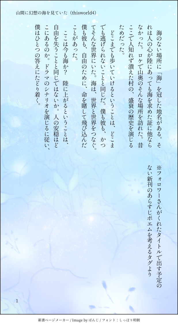 こうみ☆quiet followMOURNING山間に幻想の海を見ていた ##供養 Tap to full screen (size:618x1132).Repost is prohibited Let's send reactions! freqpopularsnackothersPayment processing Replies from the creator Follow creator you care about!☆quiet follow こうみDONE死に方を決めること 4 こうみDONEキャットウォークをつたう夜 8 こうみValentineデートはひと月後の予定 3 こうみDONE重ねた温度でうそを守って(環壮)5部配信分後の夜 3 こうみHappy New Yearステージの上で待ち合わせ(環壮) 3 こうみDONElifeis 露天風呂 2 recommended works gargantuapocketMOURNING諸々の理由でこっちに。気が向いたらなんか考える。 komehazesukiMOURNINGアルジュナくんが描けない 10♦︎MOURNING2013頃。 こうみMEMOこないだ環くんを起こしに部屋へ行ったら、上半身裸で、こないだあげた腹巻きだけしてた。 こうみMEMO環くんが仕事前にくれたレモンキャンディ。口の中ですぐほろほろっと溶けた。 こうみMEMO失礼を承知で、環くんの進路について、社長に伺いに上がりました。ごめんなさい。結論からいうと、環くんはアイドルを本業にすることを考えているそうだった。 2 こうみMEMO丸一日スタジオにいると、時が経つのを忘れてしまうね。万理さんが慌てて呼びにきたと思ったら、二十二時を回ってた。 こうみMEMO寝坊した……死ぬかと思った……思い出してもぞっとする。環くんに叩き起こされた。昨日環くんだけでも少し昼寝させておいてよかった……。 2 こうみMEMOところで「結構できた気がする」というのは、勉強不足ゆえの錯覚だよ!