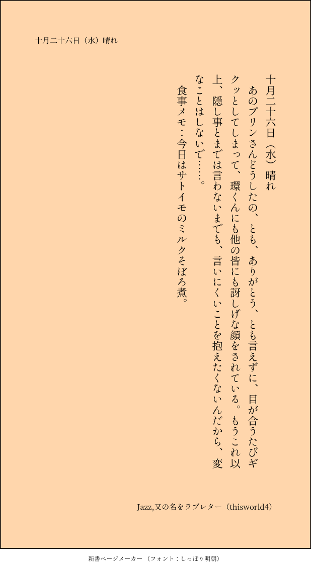 こうみ☆quiet followMEMOもうこれ以上、隠し事とまでは言わないまでも、言いにくいことを抱えたくないんだから、変なことはしないで……。 ##日記本 Tap to full screen (size:618x1132).Repost is prohibited Let's send reactions! freqpopularsnackothersPayment processing Replies from the creator Follow creator you care about!☆quiet follow こうみDONE死に方を決めること 4 こうみDONEキャットウォークをつたう夜 8 こうみValentineデートはひと月後の予定 3 こうみDONE重ねた温度でうそを守って(環壮)5部配信分後の夜 3 こうみHappy New Yearステージの上で待ち合わせ(環壮) 3 こうみDONElifeis 露天風呂 2