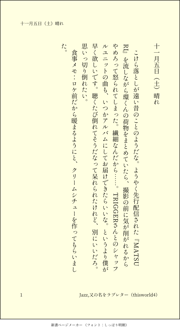 こうみ☆quiet followMEMO『MATSURI』を流しながら環くんの荷物をまとめていたら、撮影の前に気が削がれるからやめろって怒られてしまった。繊細なんだから……。 ##日記本 Tap to full screen (size:618x1132).Repost is prohibited Let's send reactions! freqpopularsnackothersPayment processing Replies from the creator Follow creator you care about!☆quiet follow こうみDONE死に方を決めること 4 こうみDONEキャットウォークをつたう夜 8 こうみValentineデートはひと月後の予定 3 こうみDONE重ねた温度でうそを守って(環壮)5部配信分後の夜 3 こうみHappy New Yearステージの上で待ち合わせ(環壮) 3 こうみDONElifeis 露天風呂 2