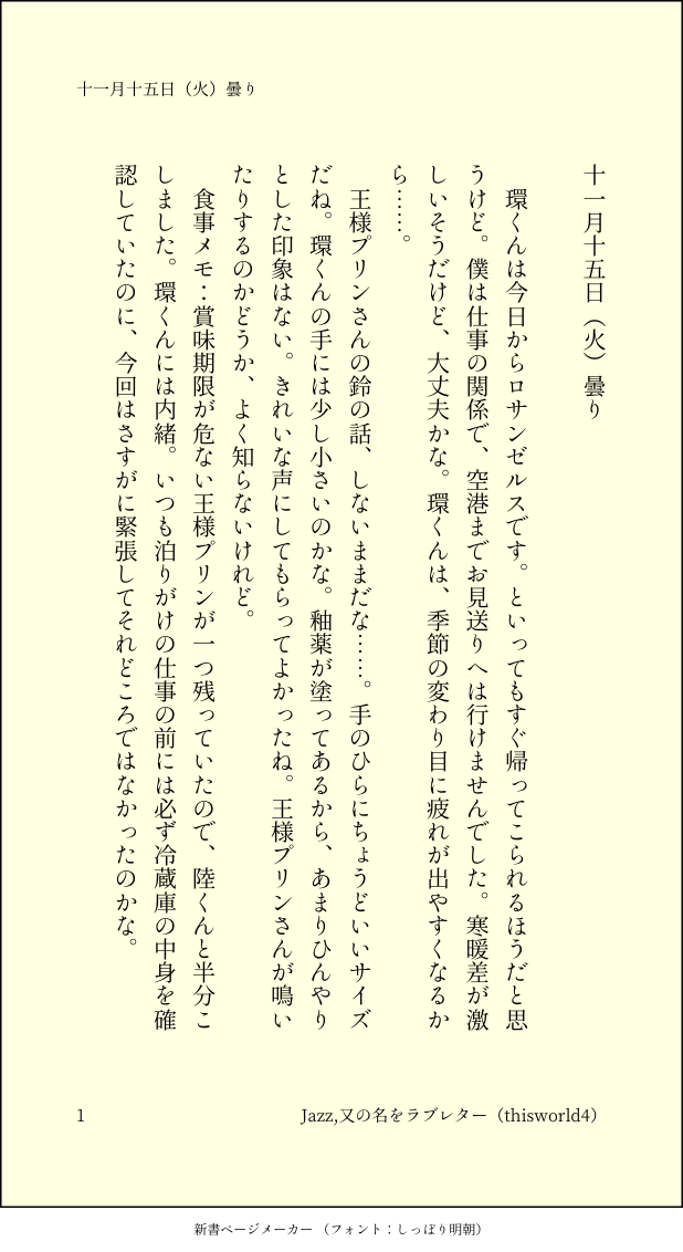 こうみ☆quiet followMEMO僕は仕事の関係で、空港までお見送りへは行けませんでした。寒暖差が激しいそうだけど、大丈夫かな。環くんは、季節の変わり目に疲れが出やすくなるから……。 ##日記本 Tap to full screen (size:618x1132).Repost is prohibited Let's send reactions! freqpopularsnackothersPayment processing Replies from the creator Follow creator you care about!☆quiet follow こうみDONE死に方を決めること 4 こうみDONEキャットウォークをつたう夜 8 こうみValentineデートはひと月後の予定 3 こうみDONE重ねた温度でうそを守って(環壮)5部配信分後の夜 3 こうみHappy New Yearステージの上で待ち合わせ(環壮) 3 こうみDONElifeis 露天風呂 2