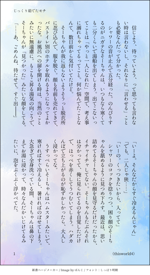 こうみ☆quiet followDONEじっくり茹でたモチ(環壮)アニナナ11話のラストシーンより(?)後日付き合った後の環壮※会話の中で、環くんに気がある女の子の話題が出てきます ##小話 show all(+7 images) Tap to full screen (size:618x1132).Repost is prohibited Let's send reactions! freqpopularsnackothersPayment processing Replies from the creator Follow creator you care about!☆quiet follow こうみDONE死に方を決めること 4 こうみDONEキャットウォークをつたう夜 8 こうみValentineデートはひと月後の予定 3 こうみDONE重ねた温度でうそを守って(環壮)5部配信分後の夜 3 こうみHappy New Yearステージの上で待ち合わせ(環壮) 3 こうみDONElifeis 露天風呂 2 recommended works Ochora_choDOODLE体育祭シーズンに描いてたやつを今更…笑私の母校の伝統になってた女子のタイヤ奪いです。当時、普段大人しい2人が熱い戦いしてたので進撃の最強女子2人に再現してもらいました👏 gargantuapocketMOURNINGデータ整理中に発掘。物語の残骸的な。 5 こうみMEMO環くんが時々僕をじっと見るのが、苦手かもしれない。 こうみMEMOこないだ環くんを起こしに部屋へ行ったら、上半身裸で、こないだあげた腹巻きだけしてた。 こうみMEMO今回は十代の子たちが色々抱えているし、大人の僕たちがしっかりしなくちゃ。 こうみMEMO失礼を承知で、環くんの進路について、社長に伺いに上がりました。ごめんなさい。結論からいうと、環くんはアイドルを本業にすることを考えているそうだった。 2 こうみMEMO僕と環くん……MEZZO"の仕事じゃなくても、よく目を合わせるようになったね。 こうみMEMOさて、期末テストの科目を見直してみたけれど、現代文はおおむね大丈夫だね。古典は鉛筆を転がして運が良ければというところだね。数学はいずれもダメです。 2 こうみMEMO怒らせたというか、口も聞かずに思い切り両頬をつねられたのだけど、絶対こめかみに青筋が浮いていたよね。