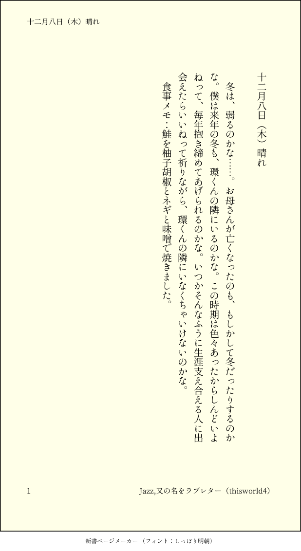 こうみ☆こそフォロメモいつかそんなふうに生涯支え合える人に出会えたらいいねって祈りながら、環くんの隣にいなくちゃいけないのかな。 ##日記本 タップで全画面(原寸:618x1132)無断転載禁止 リアクションをたくさん送って応援しよう! よく使う人気おやつその他支払処理中 作者からのリプライ 気になる人をどんどんフォローしよう!☆こそフォロ こうみできた死に方を決めること 4 こうみできたキャットウォークをつたう夜 8 こうみバレンタインデートはひと月後の予定 3 こうみできた重ねた温度でうそを守って(環壮)5部配信分後の夜 3 こうみあけおめステージの上で待ち合わせ(環壮) 3 こうみできたlifeis 露天風呂 2 おすすめ作品 ofujisan17供養作ったけど、使わないキャラ。ポーズアプリ使ったけど、腕がヘン…なので、ボツ! こうみメモ末年始は何かとバタつくので、四月始まりにしました。昨年こそきちんと日記をつけておけばよかった。 2 こうみメモ他のメンバーの前では大笑いしているところを初めて見た時、当時はあまり考えないようにしていたけど、やっぱりショックだったな……。 2 こうみメモ環くんのモノマネ、全然違うって言われてしまったけど、まだ観察が足りないかな……? 2 こうみメモ寝相についてちょっと言ったら、「寝てる時までしっかりしろなんて無茶言うな」って怒られた。 こうみメモいつチャンスが来ても話せるようにしておこう。 こうみメモ環くんを駅まで迎えにいったのですが、なぜか学校に折り畳み傘を忘れてきました。なんのために折り畳んであると思ってるのでしょうか。 こうみメモ背中と背中をもどかしいくらいの距離でくっつけられて、逆に動けなくなってしまった。二、三カットくらいの間かな……指が触れてた。 taaaaaadano供養アイコン用に影をつけた雉くん