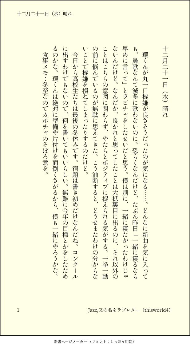 こうみ☆quiet followMEMO環くんが丸一日機嫌が良さそうだったのが気になる……。 ##日記本 Tap to full screen (size:618x1132).Repost is prohibited Let's send reactions! freqpopularsnackothersPayment processing Replies from the creator Follow creator you care about!☆quiet follow こうみDONE死に方を決めること 4 こうみDONEキャットウォークをつたう夜 8 こうみValentineデートはひと月後の予定 3 こうみDONE重ねた温度でうそを守って(環壮)5部配信分後の夜 3 こうみHappy New Yearステージの上で待ち合わせ(環壮) 3 こうみDONElifeis 露天風呂 2