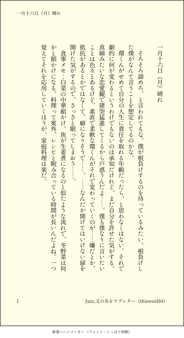 こうみ☆quiet followMEMO僕も僕なりに言いたいことは色々とあるけど、素直で柔軟な環くんがそれで変わっていくのが……嫌だとか、抵抗があるとかではなくて、癖になりそうで……。 ##日記本 Tap to full screen (size:618x1132).Repost is prohibited Let's send reactions! freqpopularsnackothersPayment processing Replies from the creator Follow creator you care about!☆quiet follow こうみDONE死に方を決めること 4 こうみDONEキャットウォークをつたう夜 8 こうみValentineデートはひと月後の予定 3 こうみDONE重ねた温度でうそを守って(環壮)5部配信分後の夜 3 こうみHappy New Yearステージの上で待ち合わせ(環壮) 3 こうみDONElifeis 露天風呂 2 recommended works gargantuapocketMOURNINGどう頑張っても思った模様が出なくってボツ ofujisan17MOURNING作ったけど、使わないキャラ。ポーズアプリ使ったけど、腕がヘン…なので、ボツ! ⑅·*❁¨̮❁*·⑅MAIKINGカービィ落書き。アナログ描きかけからデジタル途中詰め3枚。よく分からないものが出来ました(汗)綺麗に描けなくて毎回挫折。デジ絵初心者の為エフェクト等素材が豊富すぎて全く使いこなせません(´;ω;`) 3 こうみMEMO心配になったけど、感傷に浸ってたわけではないみたい。綺麗で見惚れたんだって。僕もちょっと見惚れた。 こうみMEMO環くんを駅まで迎えにいったのですが、なぜか学校に折り畳み傘を忘れてきました。なんのために折り畳んであると思ってるのでしょうか。 こうみMEMO嬉しいぶん、緊張の度合いも強い。環くんにはもう見透かされているみたいで、「楽しんでこーぜ」って初歩的なこと言われちゃった。 こうみMEMO明後日はスイーツバイキングの店員さんなんだから、あまり目を腫らさないでほしい……。 こうみMEMO「いつまで頑張ればいいの」とまた泣かれてしまった。 こうみMEMO本当はテスト期間中一度くらい、環くんが僕の部屋に勉強しに来ないかなって思ってた。